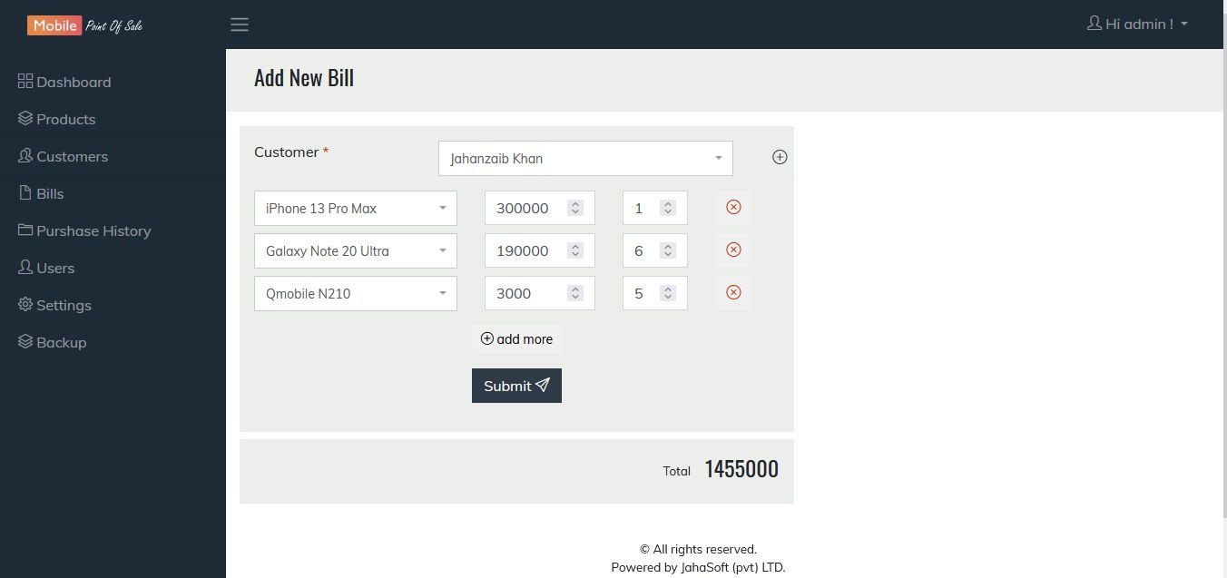 It has the Bill Number, Customer Name, Model of the mobile, IMEI, Price,