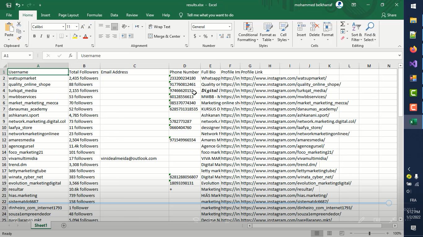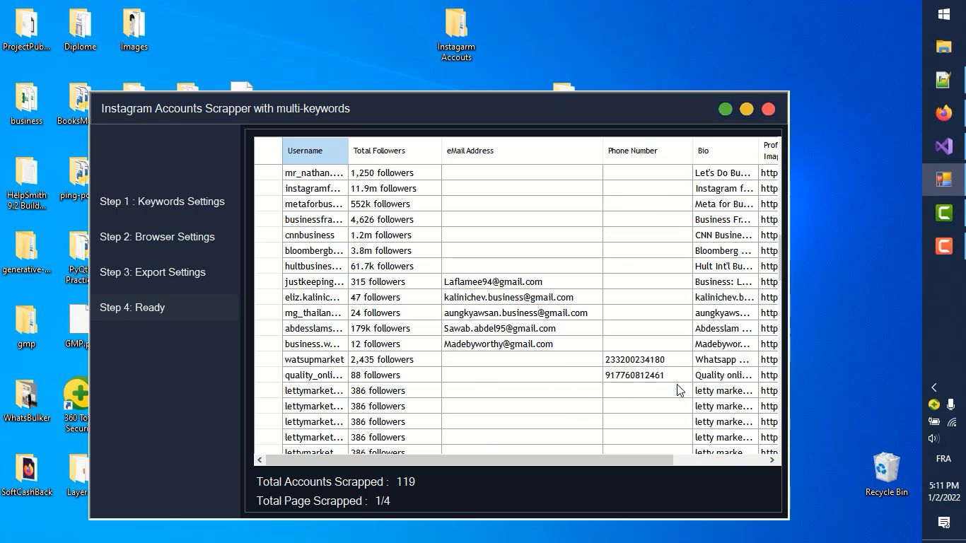 Instagram Accounts Scrapper(with multi-keywords) is an advanced tool that can scrape accounts based on a keyword(s), the tool extract this information: Username, Email Address, Phone Number, Username, Total Followers, Full Bio, Profile Link, Profile Image.