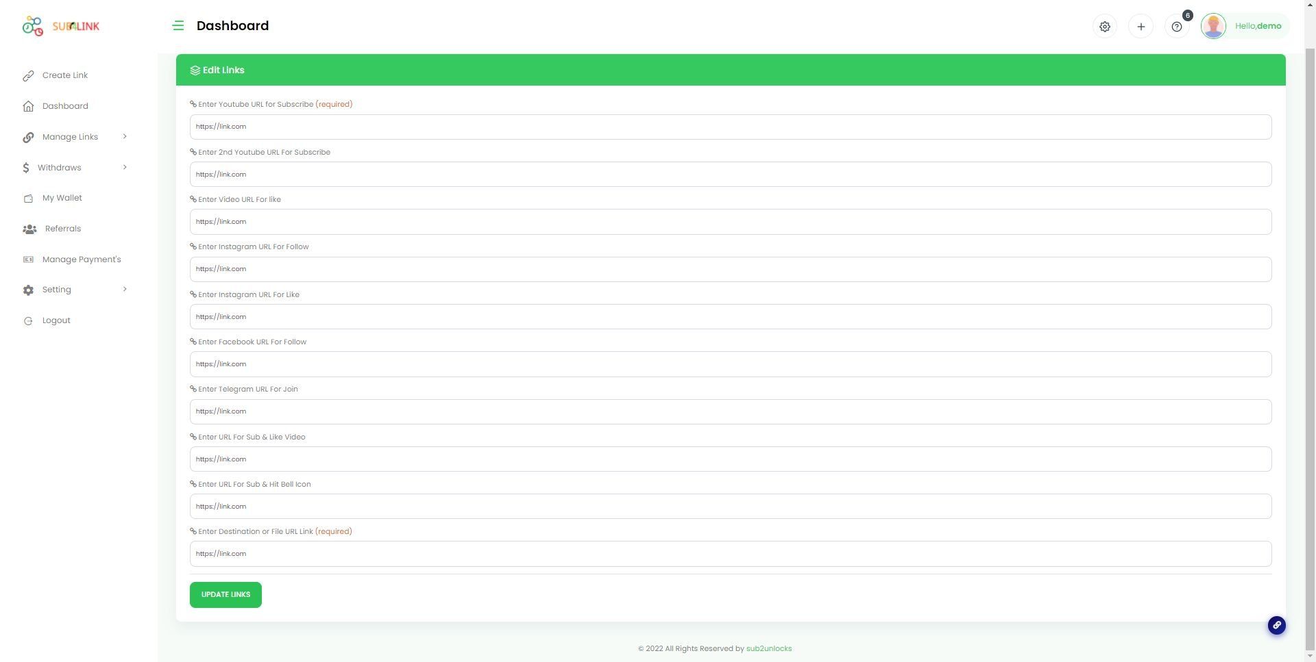 Admin Demo :- https://sub2unlocks.com/site/admin