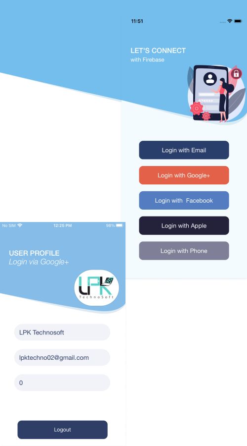 This complete app written in swift 5 with Firebase configuration. Firebase Authentication provides backend services, easy-to-use SDKs, and ready-made UI libraries to authenticate users to your app. Using Firebase auth it’s too easy to implement & use their services. Firebase Authentication integrates tightly with other Firebase services. After a successful sign in, you can access the user's basic profile information, and you can control the user's access to data stored in other Firebase products. In this app user can authentication using passwords, phone numbers, popular federated identity providers like Google, Facebook and Apple. User can easily add any of these login method in their project without extra efforts. All login method programmed with less code with appropriate comments. So you can easily implement in your project within minimum time. It's too easy to re-design because, all screen's design with Main.Storyboard. After login, you can see information of logged user with login method's name.