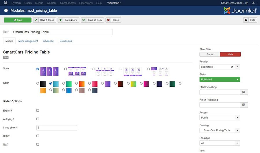 In the module configuration have basic setting includes style, color, active slider mode, and manage the tables.