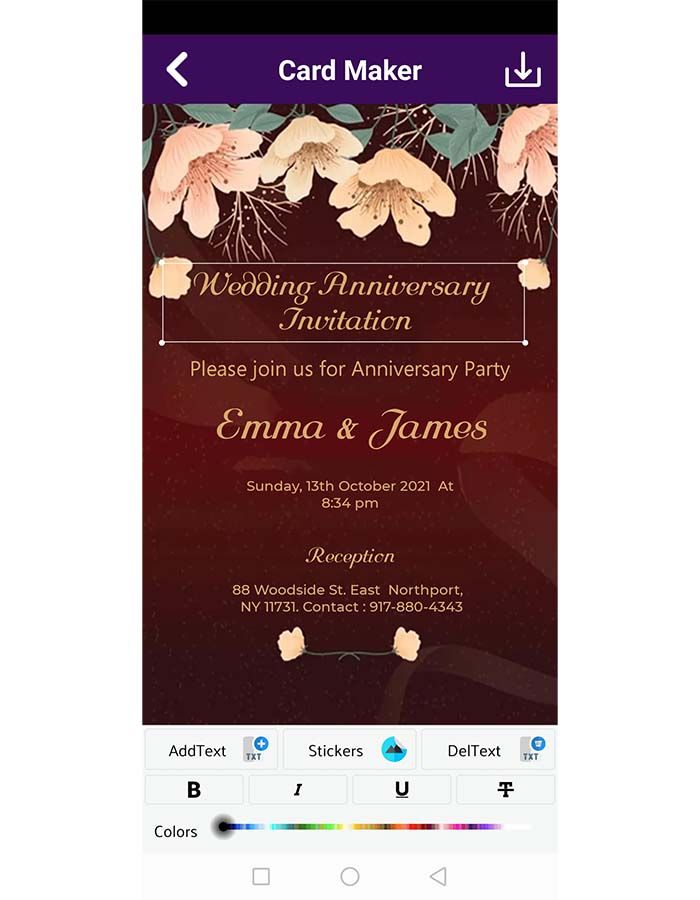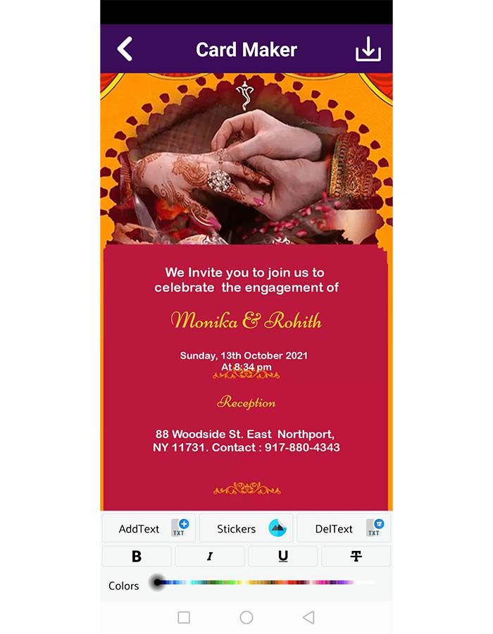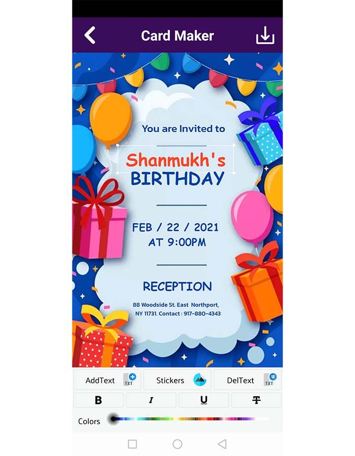 - Edit Invitation card text, text color, Add Stickers, Delete Text