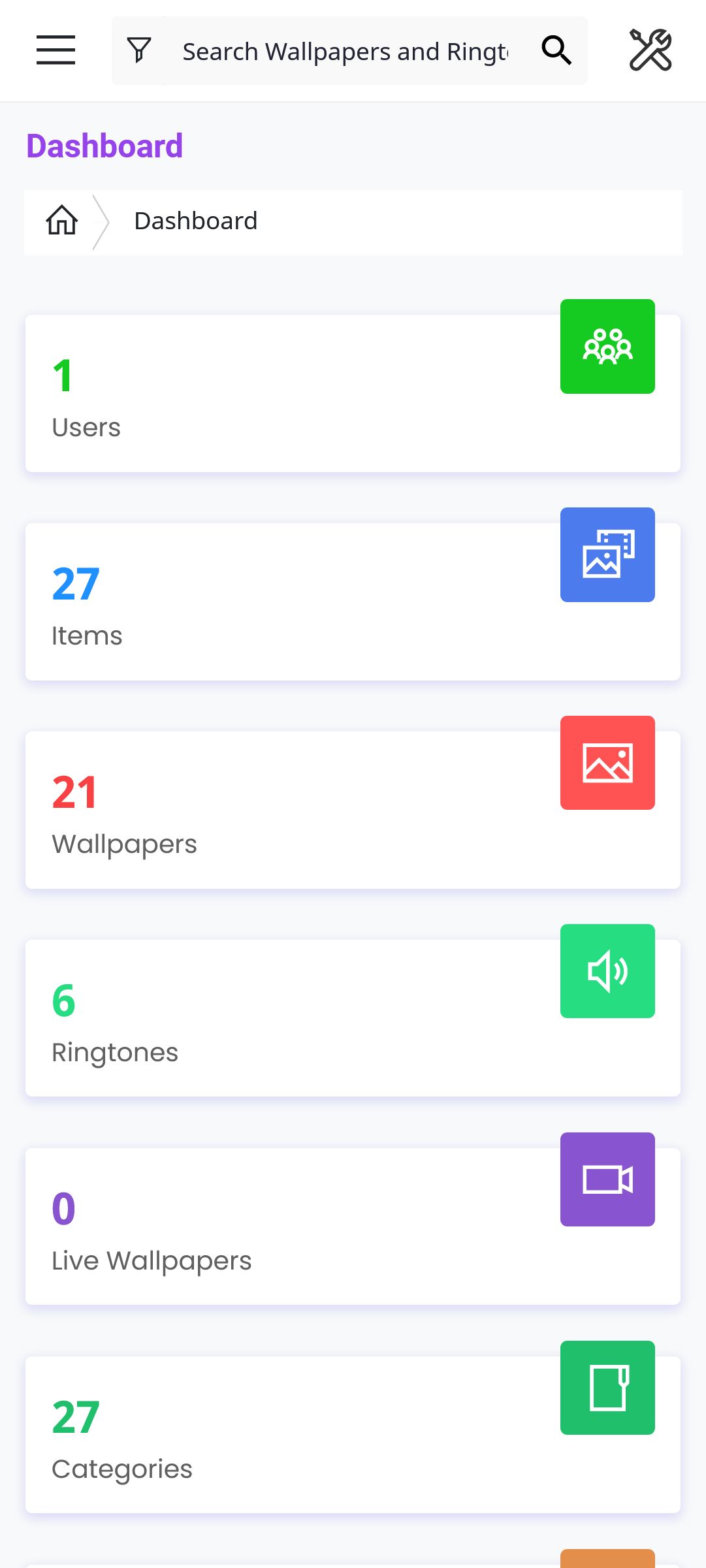- Statistics about total: Users, Items, Wallpapers, Ringtones, Live Wallpapers, Categories, Comments, Reports, Questions