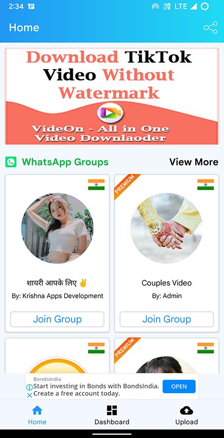- Free and Premium Groups, Free groups can be joined after clicking on them. But premium groups can be joined after watching an ad and clicking on the ad. Set premium from the admin panel for individual groups.