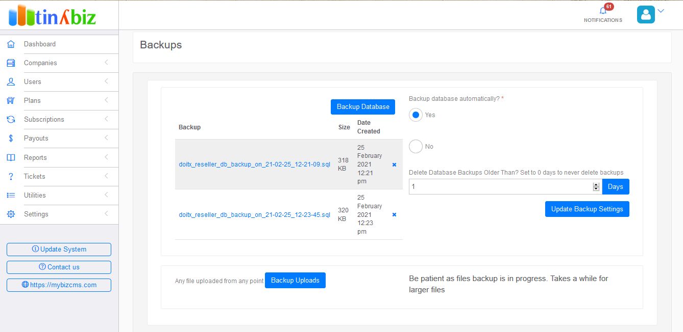 You can backup all files uploaded at any point of the system, database in SQL format. For database, you can set automatic backup after every X days to prevent losing your important data.