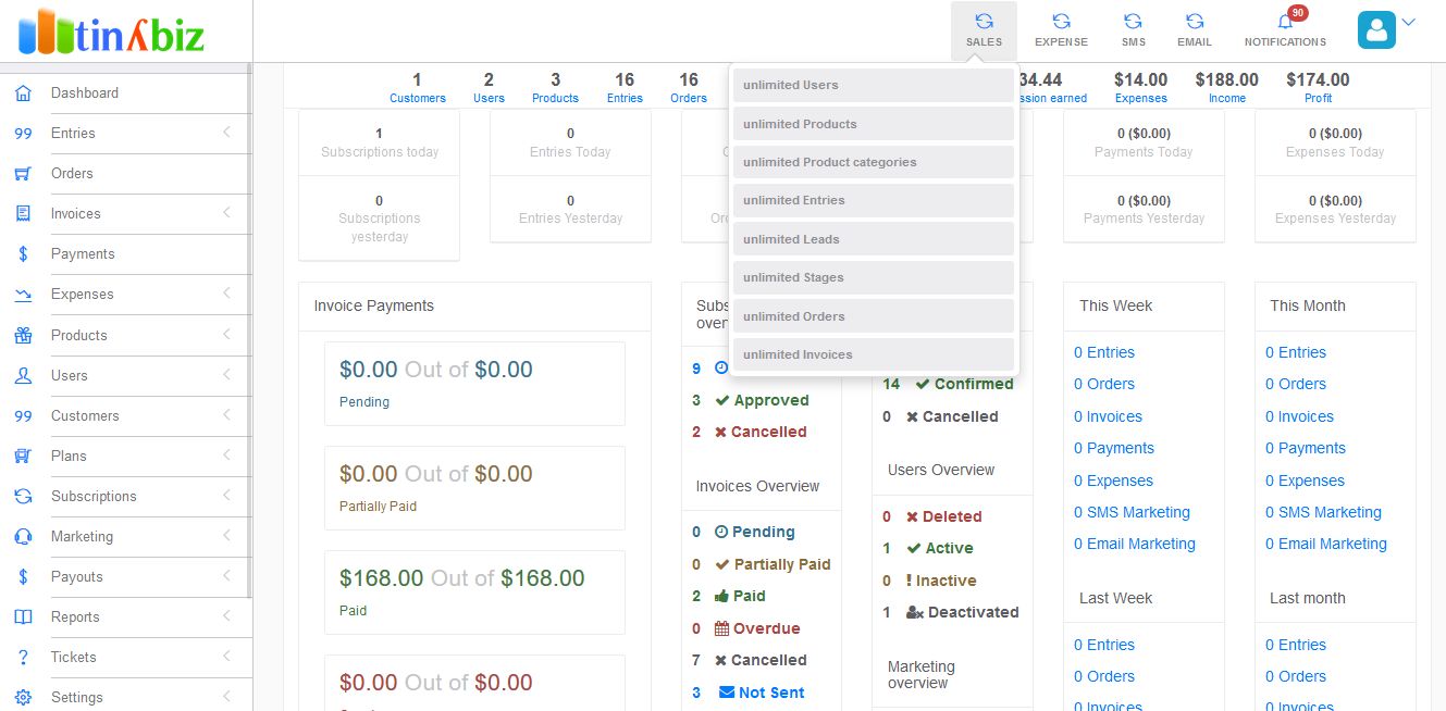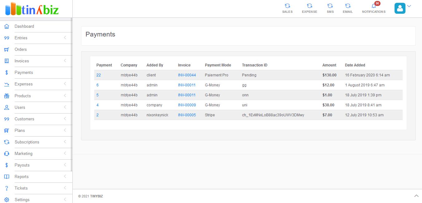 tinyBiz is a multi business Sales CRM with Invoicing, Expenses, Bulk SMS and Email Marketing software with Ecommerce module. It is the perfect application to host multiple companies sales records at one place. It is SaaS system where different companies can subscribe to sales, expenses, sms and email packages.