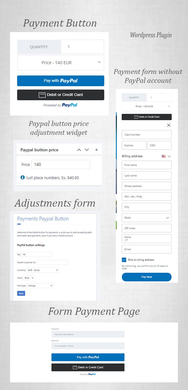 WP Paypal button and page to accept payments without requiring a customer account. The plugin allows you to integrate a payment button in any post type registered in wordpress, it will also allow you to create a payment page with a form.