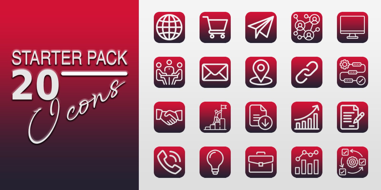Starter pack icon set. 20 square basic/general icons with gradient from red to blue and transparent icon. The icons have rounded corners. The icon set can be used for several purposes.