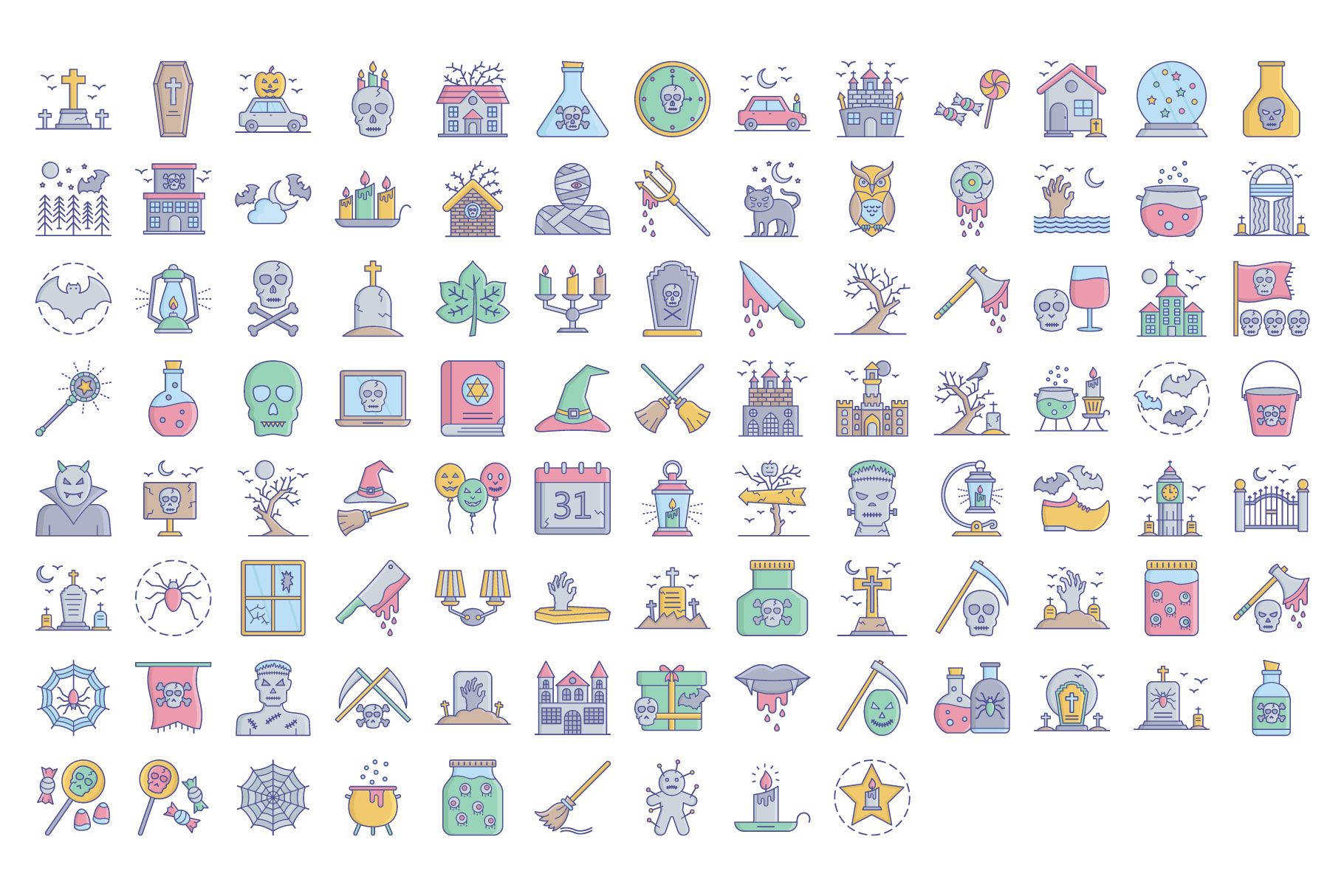| Tags | pumpkin, ghost, icons, zombie, mummy, Candle, skull, Vampire, set of halloween icons, outline halloween icons, pack of halloween, trendy halloween icons, halloween icons, halloween color vector, evil cat, witch hat, spider web, zombie hand, coffin, dead tree, gravestone, ghost spook |