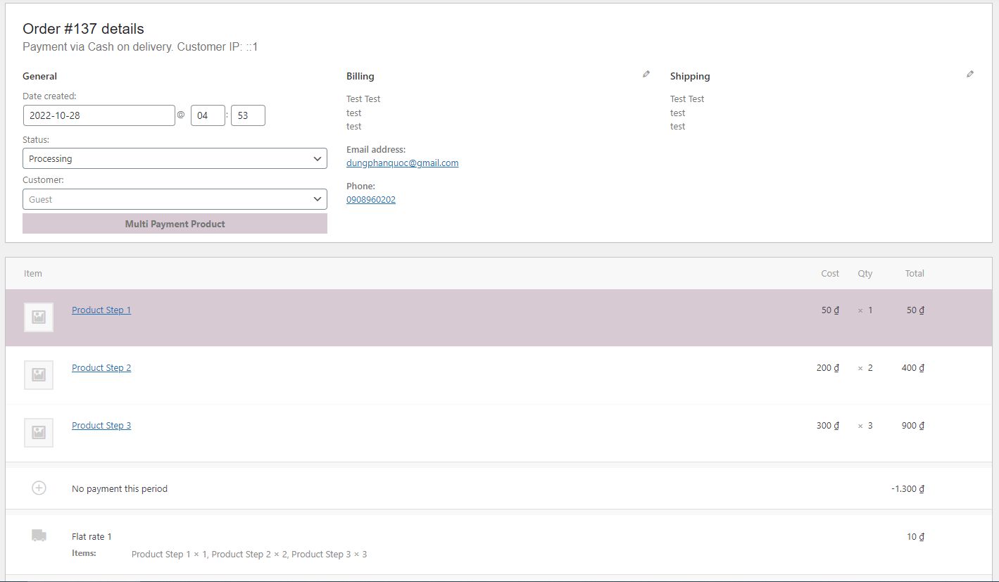 - After processing the payment, the order is created in the admin order and will mark the product [Step 1] in the Order detail.