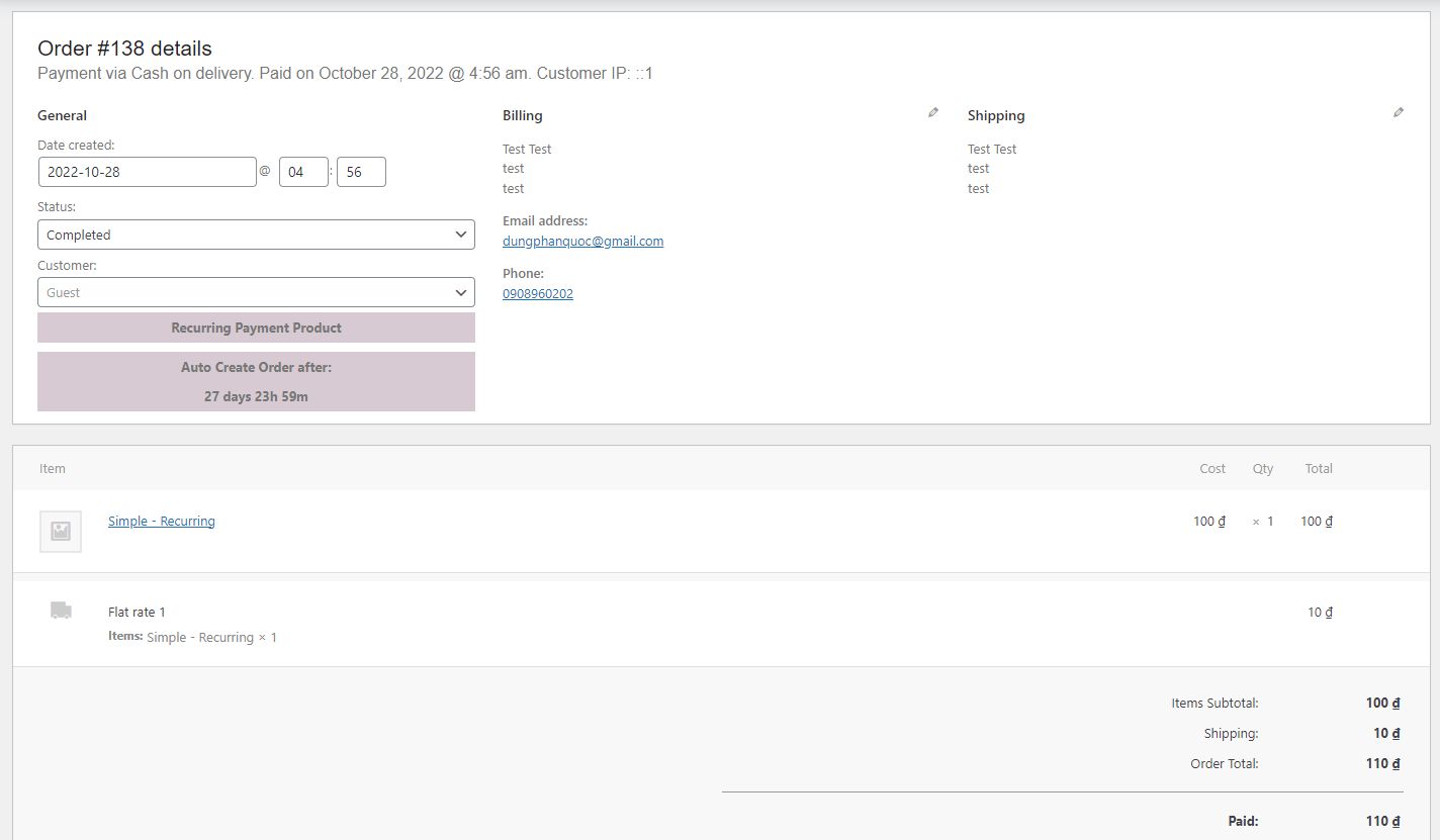 - The countdown time is calculated from the time the order status is completed, after XXX days (XXX is the number of days that are configured to repeat for Recurring Product in the admin side), the system will automatically send an email to the customer.