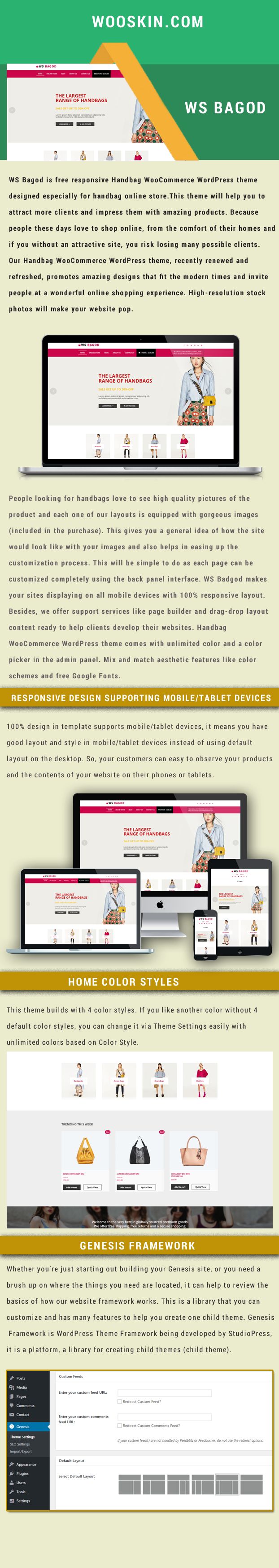 WS Bagod is free responsive Handbag WooCommerce WordPress theme designed especially for handbag online store.This theme will help you to attract more clients and impress them with amazing products. Because people these days love to shop online, from the comfort of their homes and if you without an attractive site, you risk losing many possible clients. Our Handbag WooCommerce WordPress theme, recently renewed and refreshed, promotes amazing designs that fit the modern times and invite people at a wonderful online shopping experience. High-resolution stock photos will make your website pop. People looking for handbags love to see high quality pictures of the product and each one of our layouts is equipped with gorgeous images (included in the purchase). This gives you a general idea of how the site would look like with your images and also helps in easing up the customization process. This will be simple to do as each page can be customized completely using the back panel interface. WS Badgod makes your sites displaying on all mobile devices with 100% responsive layout. Besides, we offer support services like page builder and drag-drop layout content ready to help clients develop their websites. Handbag WooCommerce WordPress theme comes with unlimited color and a color picker in the admin panel. Mix and match aesthetic features like color schemes and free Google Fonts. From here you also have access to the entire shopping process, users, products, images and any other elements that are part of the theme. Make the right choice for your business and get started today!