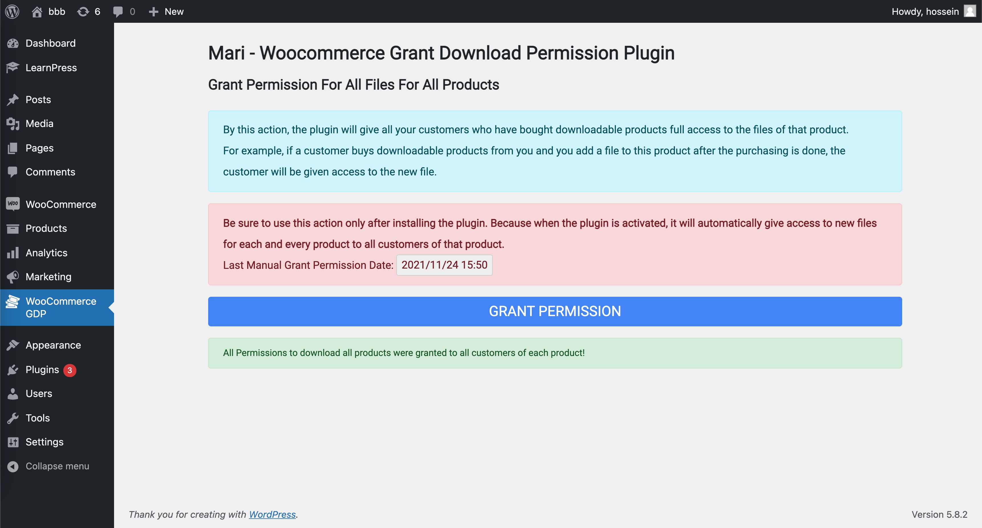 First, read the description provided and then click on the “GRANT PERMISSION” button to grant initial permission. This process might take some time, depending on the number of products and customers. After finishing the process, the following message will be displayed under the “GRANT PERMISSION” button. ‘All Permissions to download all products were granted to all customers of each product!’