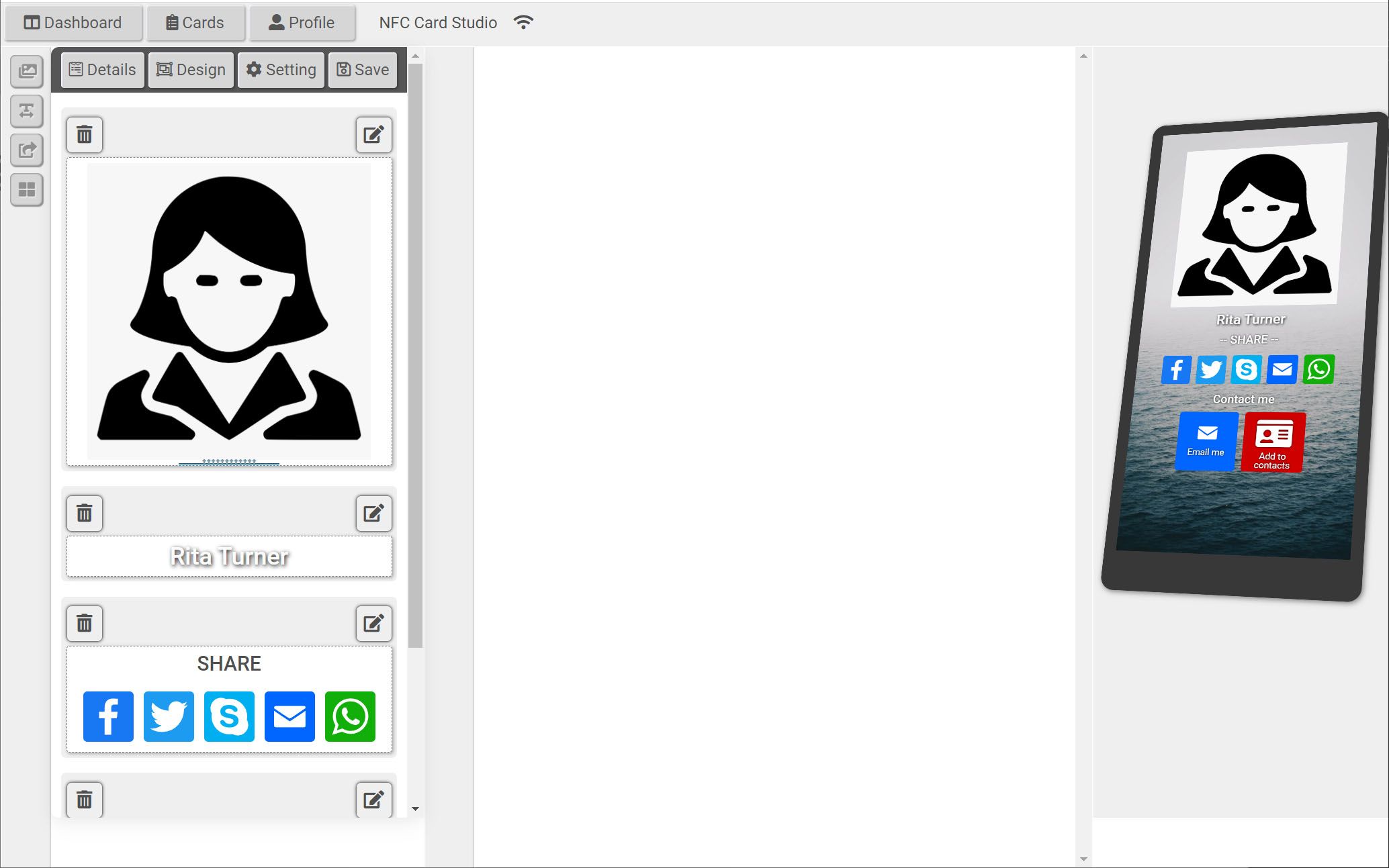 - Create customized profile page for each card to be used by NFC card or to be shared