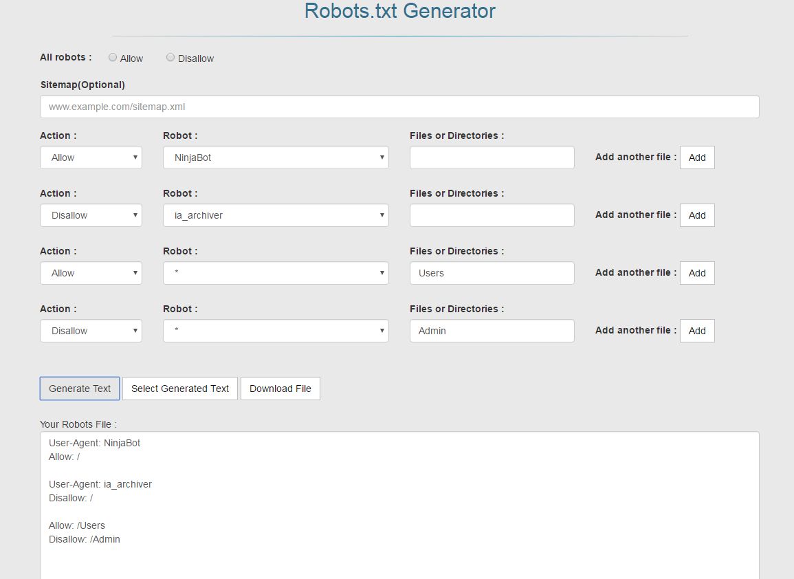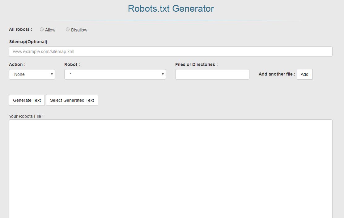 This script helps you build your robots.txt file providing 22 crawler options to better configure the crawling access to your website.