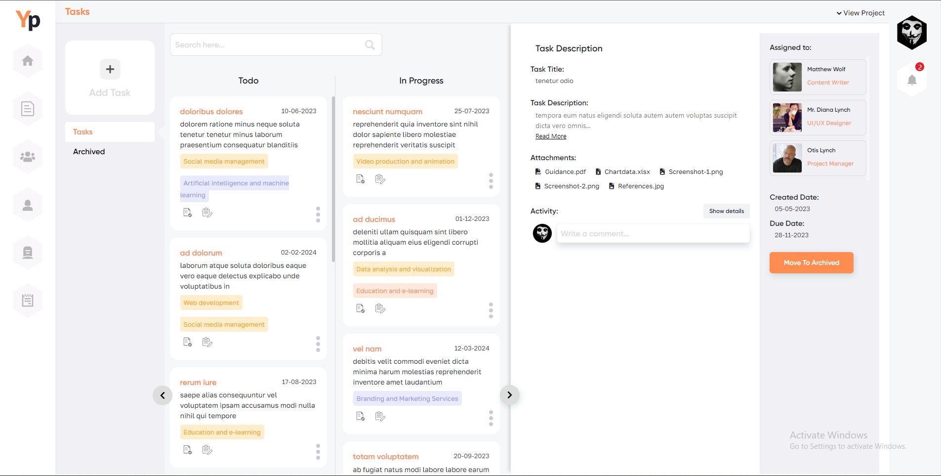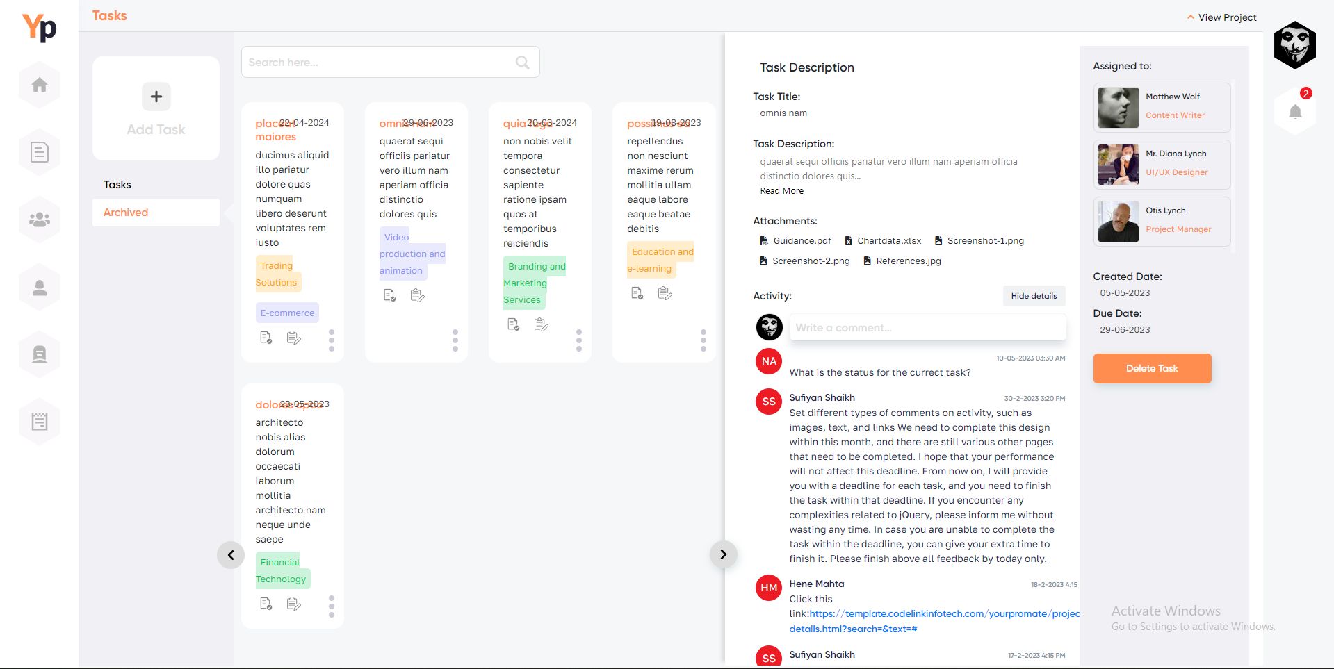 Your Promate has a task management system that enables users to add, update, view and archive tasks, and manage their status, including "todo," "in progress," and "completed." The app also includes search and filter functionality to help users find specific projects or tasks quickly. Also offer comments functionality in task so you can leave comments on specific tasks to provide updates, ask questions, or share feedback.