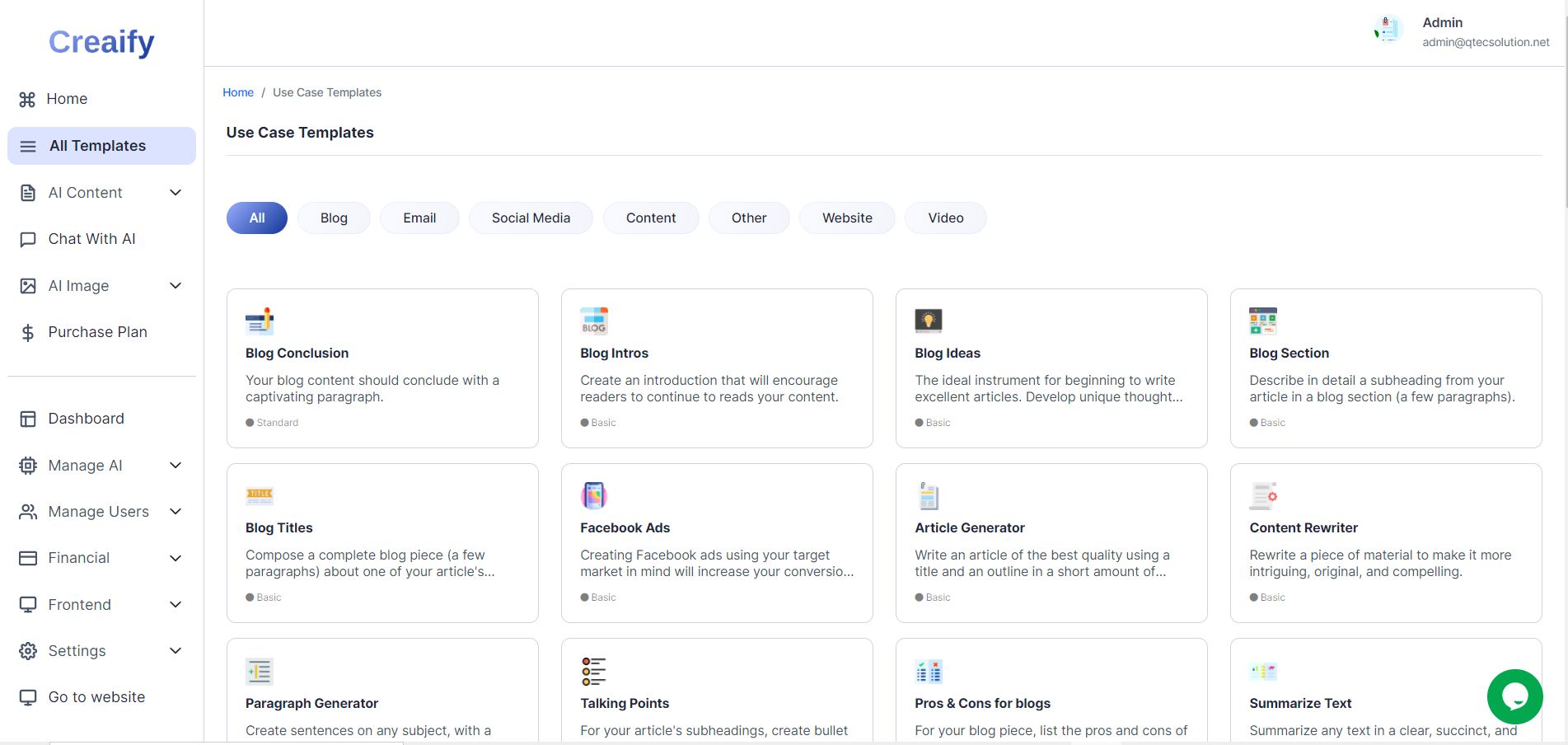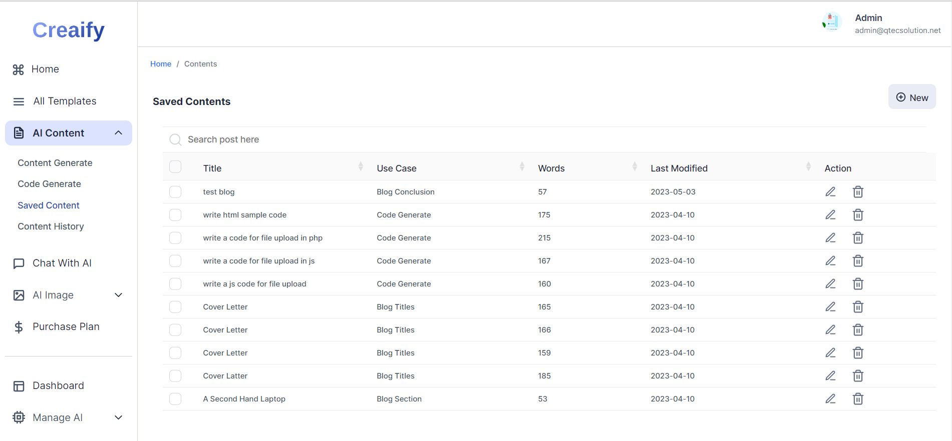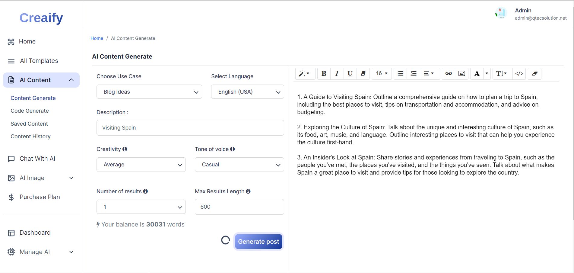 CreAiFy is a SaaS ready assistant that helps you to write various text contents like SEO writeups, taking points, FAQ, Youtube description, Facebook description, cold email, blogs, articles, ads, media with 50+ preset templates using powerful Artificial Intelligence tool OPENAI ChatGPT along with power to create Images via