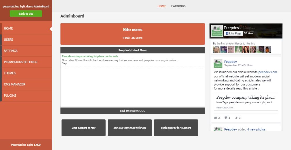Peepmatches v 1.3.0 ( 29 November 2017) - Totally New modern design . - Improved design for mobiles. - New members page with advanced filter search. - New nice profile page with full cover slideshow . - Added facebook login . - Add featured members block in user dashboard and members page ( Admin must set member as featured from member's profile). - Fontawesome integration ( if you add new page just go to http://fontawesome.io/icons/ and choose your icon then copy <i class="fa ...etc" /> code and paste it beside the menu title . - Add update status form to contacts news in user's dashboard ( Now your website users can post and say something to their contact such as facebook ) "Many of our customers request this from us". - New chat messanger look in desktop and mobile . - More theme design elements added to adminboard . - Resolved reported bugs .