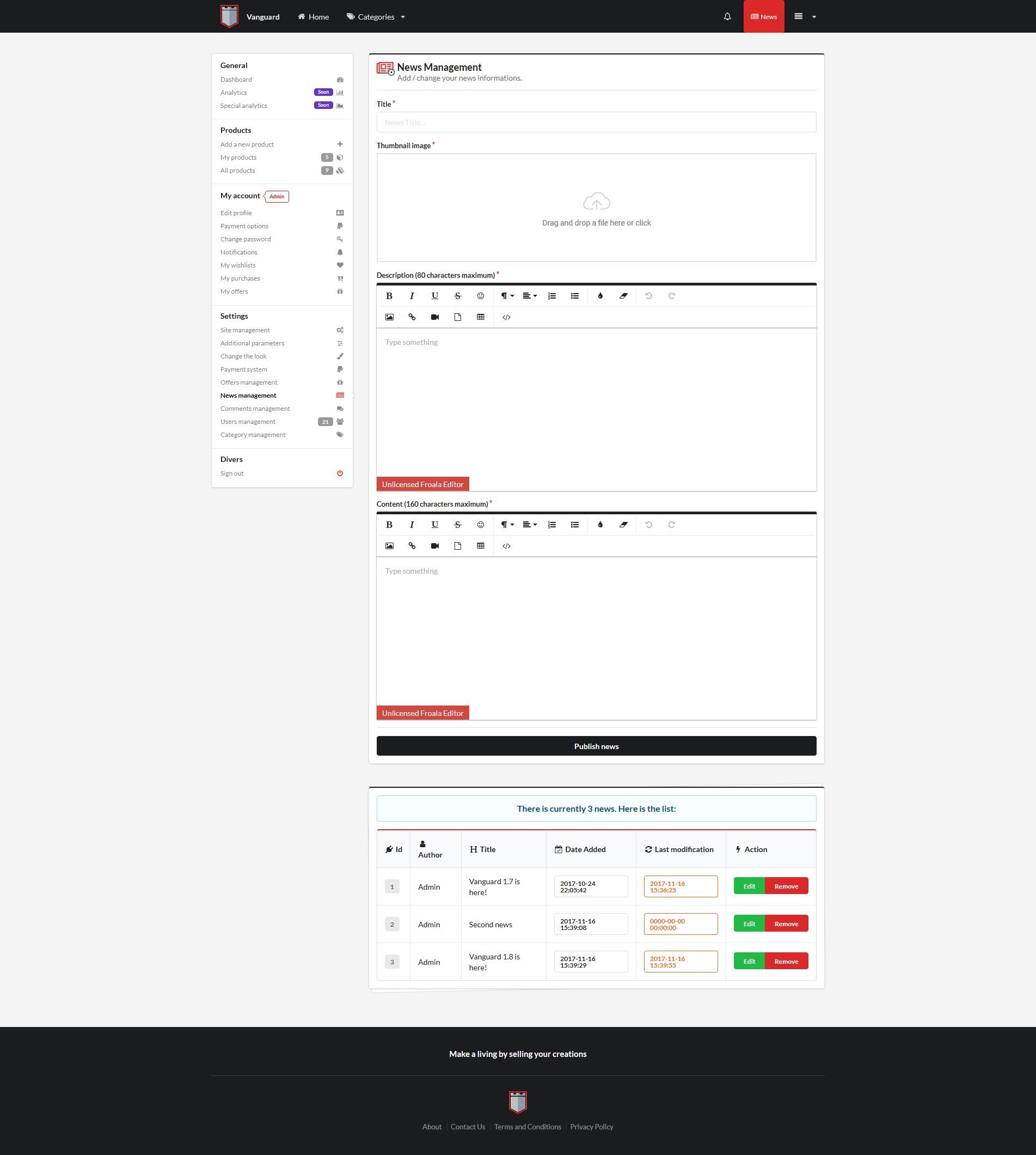 Added the possibility to modify the maximum weight when uploading a file. (.htaccess & php.ini) **If you make a change to one of these lines, you must change it in both files (.htaccess & php.ini)** Approval System (A product must be approved by an Administrator) Added a button to return to Home (register.php, login.php, user_profile.php) Added an icon to see if a product has been approved or not (all-products.php, products_list.php) Quick view of unapproved products on the Dashboard Addition of a news system for Vanguard, managed by the founder (dashboard.php)