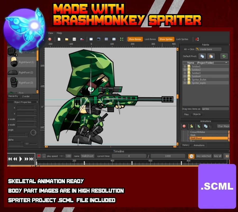 - Animation created with Brashmonkey Spriter. Skeletal animation is available. As well as exported PNG sequence, for creating traditional spritesheet