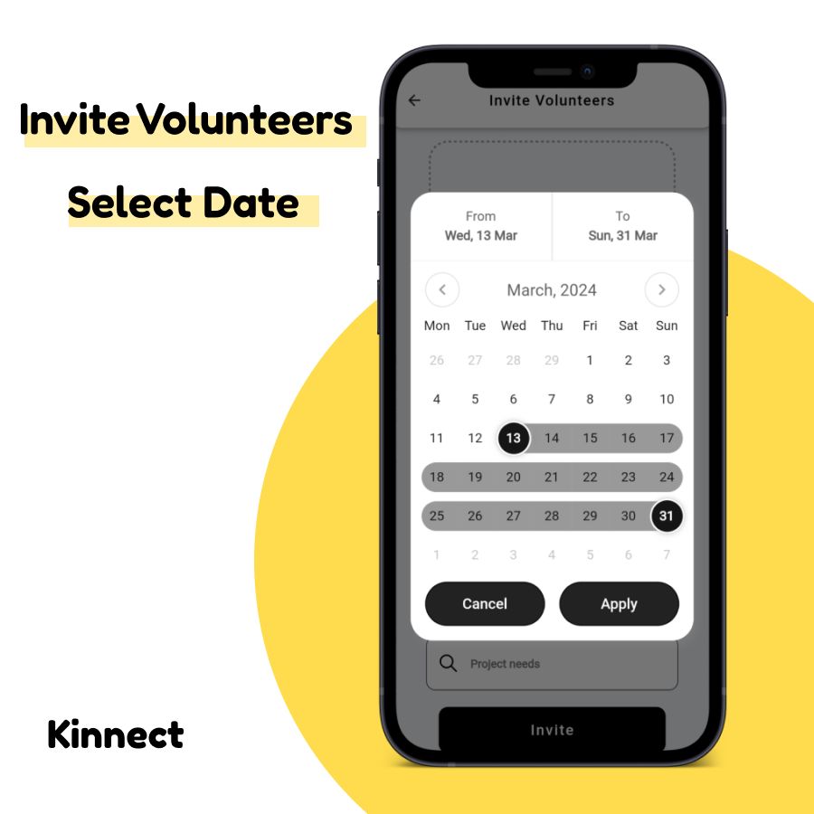 Plan ahead with Kinnect’s interactive calendar, featuring highlighted dates to visualize project availability. Avoid scheduling conflicts and stay organized as you contribute to meaningful causes.
