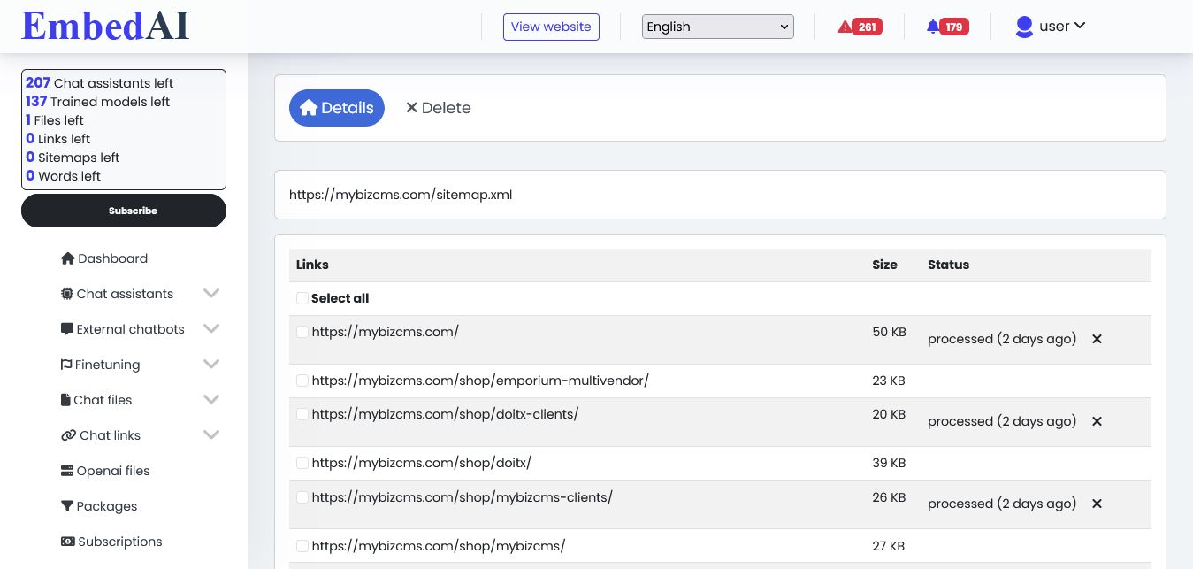 1. Introducing "Chat sitemaps" - Upload your website using a sitemap and let visitors ask questions. 2. Added option to embed website for chatting. 3. Added ability to set number of chat files, links and sitemaps in packages. 4. Updated automatic backup to set intervals between backups.