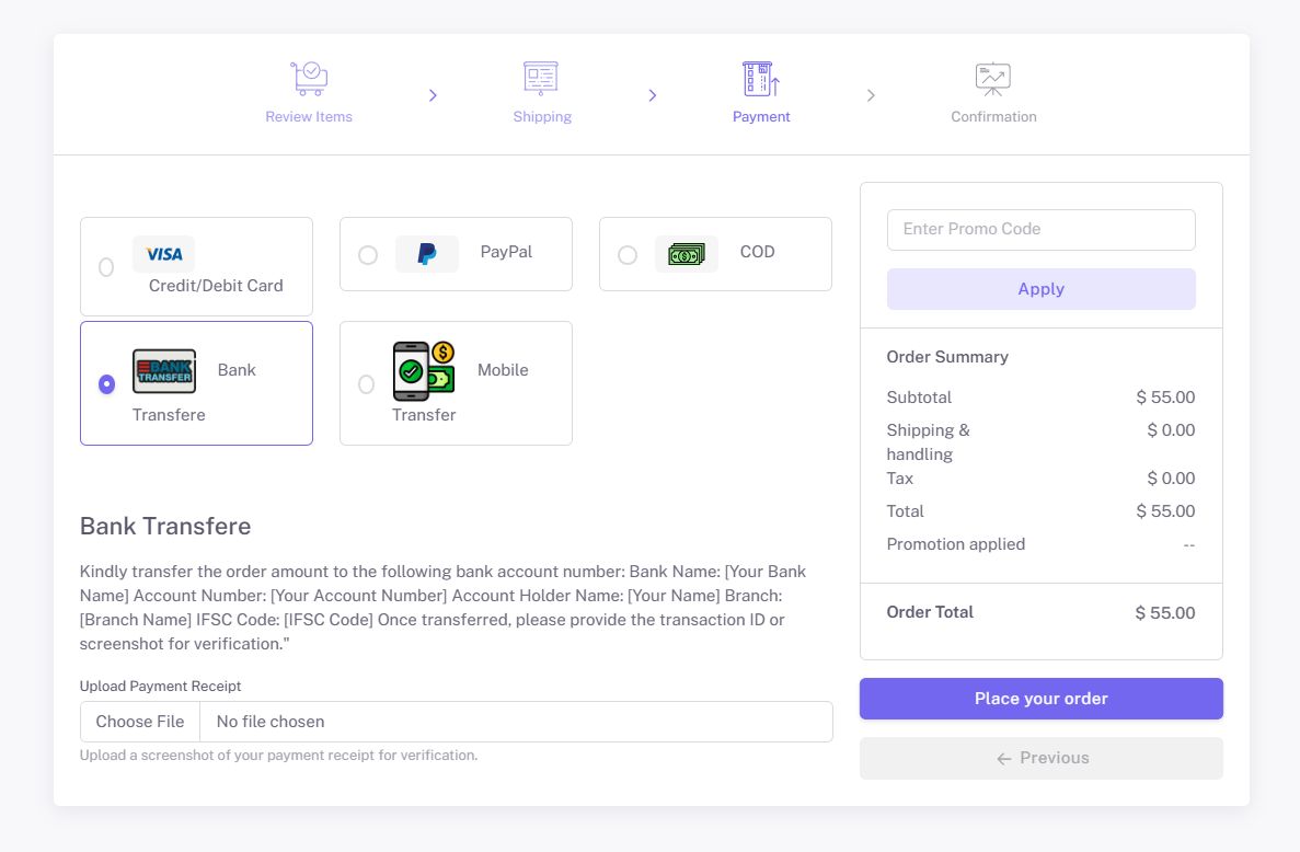 Purchase today! & use Offline Payment System for your eCommerce business which is only developed with the most efficient eCommerce cms named Ecommerce Engine cms. By this Offline Payment Addon you can get payment from your customers via bank transfer, check payment or any other custom manual payments. For example, a customer first placed an order selecting an offline payment method, then he/she can transfer money to your bank account, deposit a check into your bank account or any other method according to your instruction and submit transaction id, necessary screenshot for verification. You can finally check and approve that order and get paid.