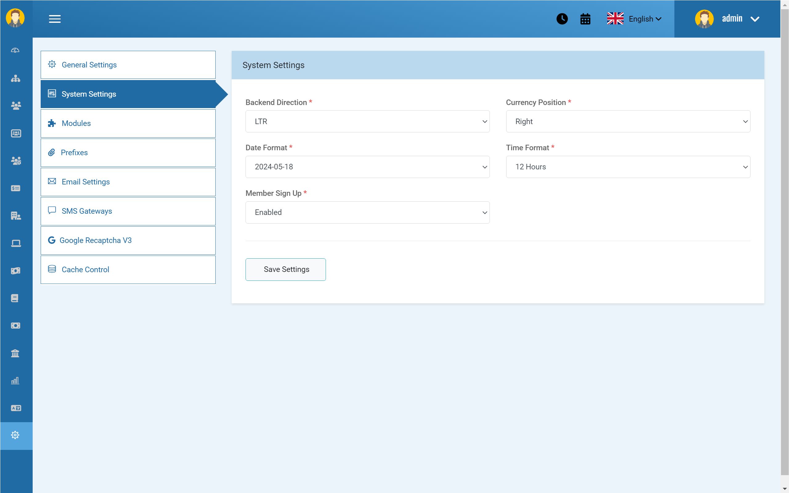 - First time admin login will take you to System Settings page so that you can configure your business settings such as Company Name, Company Logo, Default Language, Default Country Code, etc. Please set all up before using.