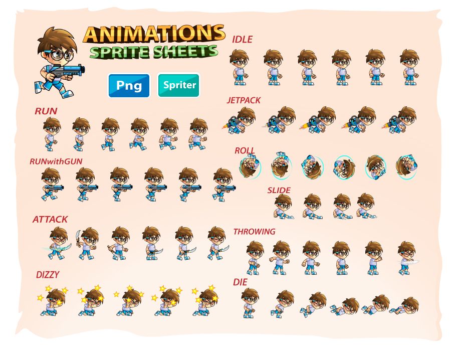 IDLE, RUN,RUNNING with GUN, THROWING, SHOT, ATTACK, ROLL,DIZZY JUMP, SLIDING, DIE.