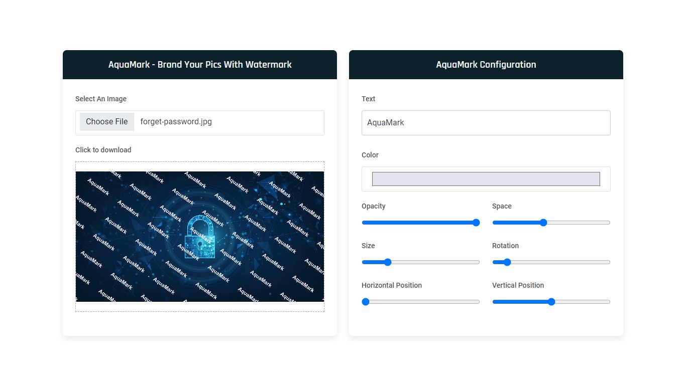 The tool also allows for rotation and spacing adjustments, ensuring your watermark blends seamlessly with your image. AquaMark's clean, responsive design, built with Bootstrap, guarantees compatibility across all devices, providing a smooth user experience.