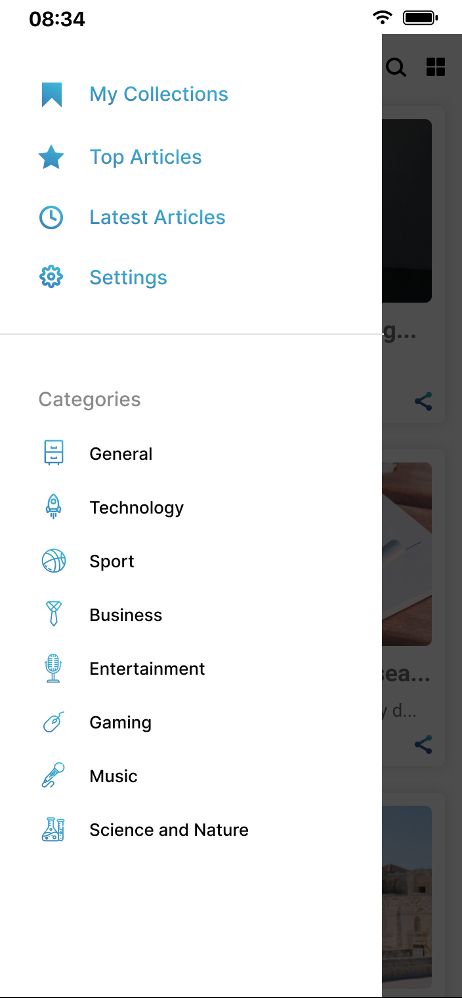 - Navigation: Side Menu for Categories / Favorites / Settings