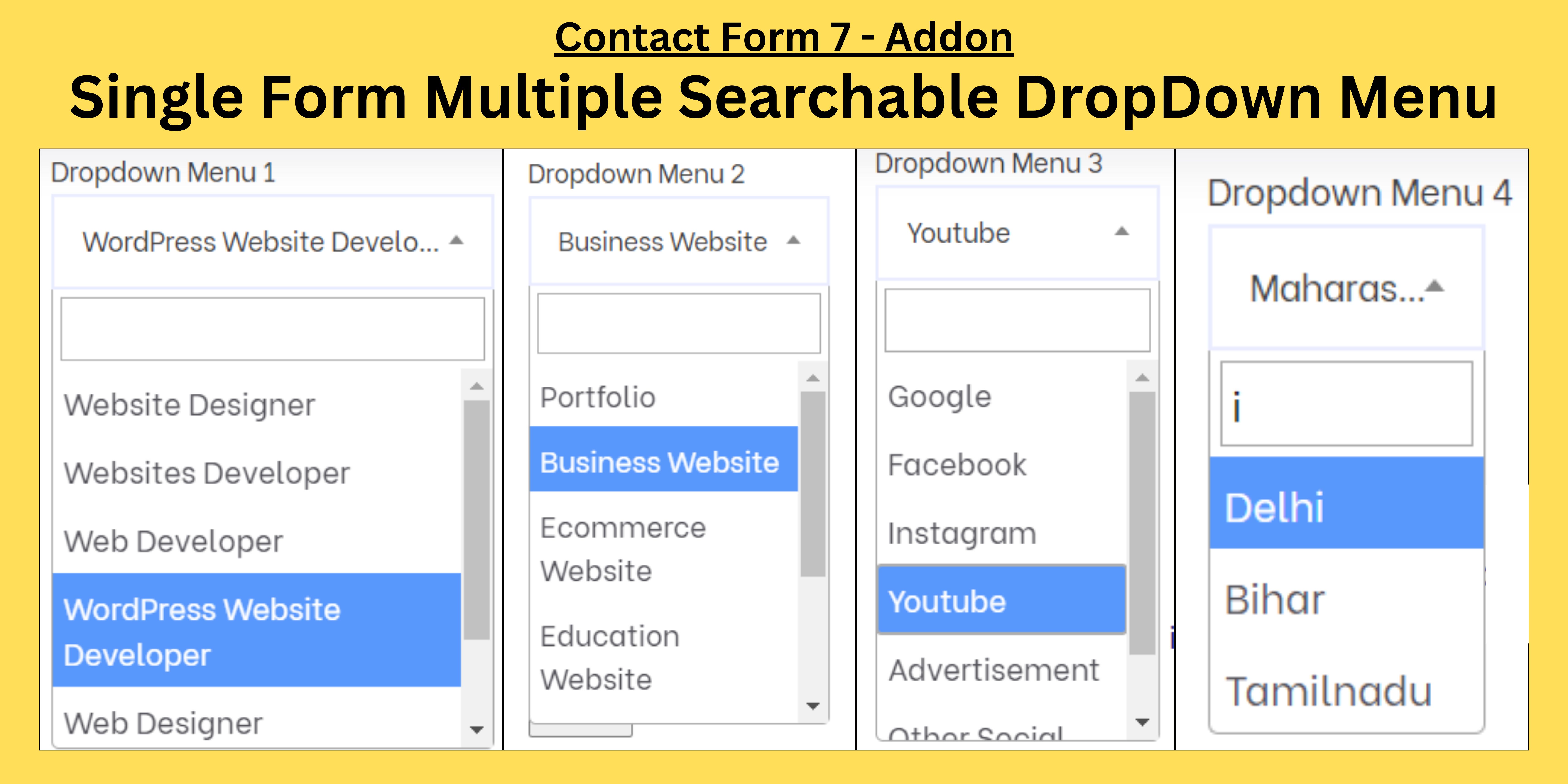 | Tags | form, contacts, contact, contact form 7 form, cf7, dropdown fields, contact form 7 dropdown fields, searchable dropdowns, contact form 7 searchable dropdowns, quickly search option, quickly search, select from dropdown menu, form 7, wordpress contact form 7 |