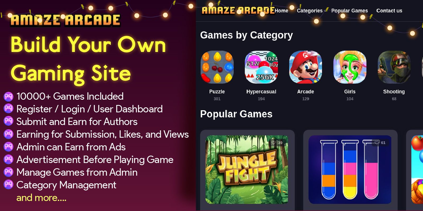 Amaze Arcade offers a full suite of features that cater to both gamers and administrators. With an intuitive setup process, robust category management, and advanced game management tools, users can easily explore and enjoy a diverse range of games. The portal is built with a focus on user engagement, incorporating features like a points system, game reports, ratings, submit and earn and dynamic content sections. For administrators, the platform includes a powerful dashboard to manage content, users, and site settings efficiently.
