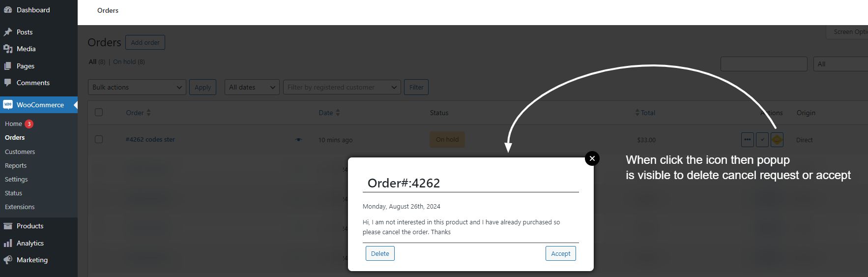 6. Order Cancellation Request Visibility: When a customer requests an order cancellation, a distinct icon with a button appears in the order grid for the admin, allowing for quick action.