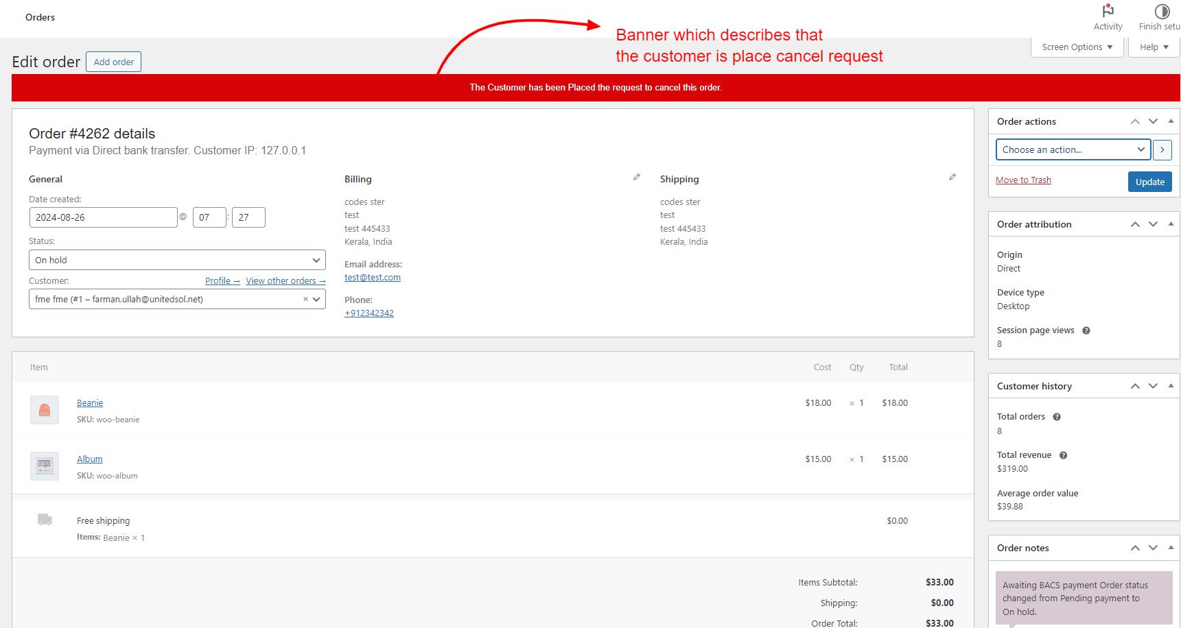 8. Order View Banner: A banner is displayed on the order view page for the admin, indicating that a cancellation request has been placed, ensuring no request is overlooked.