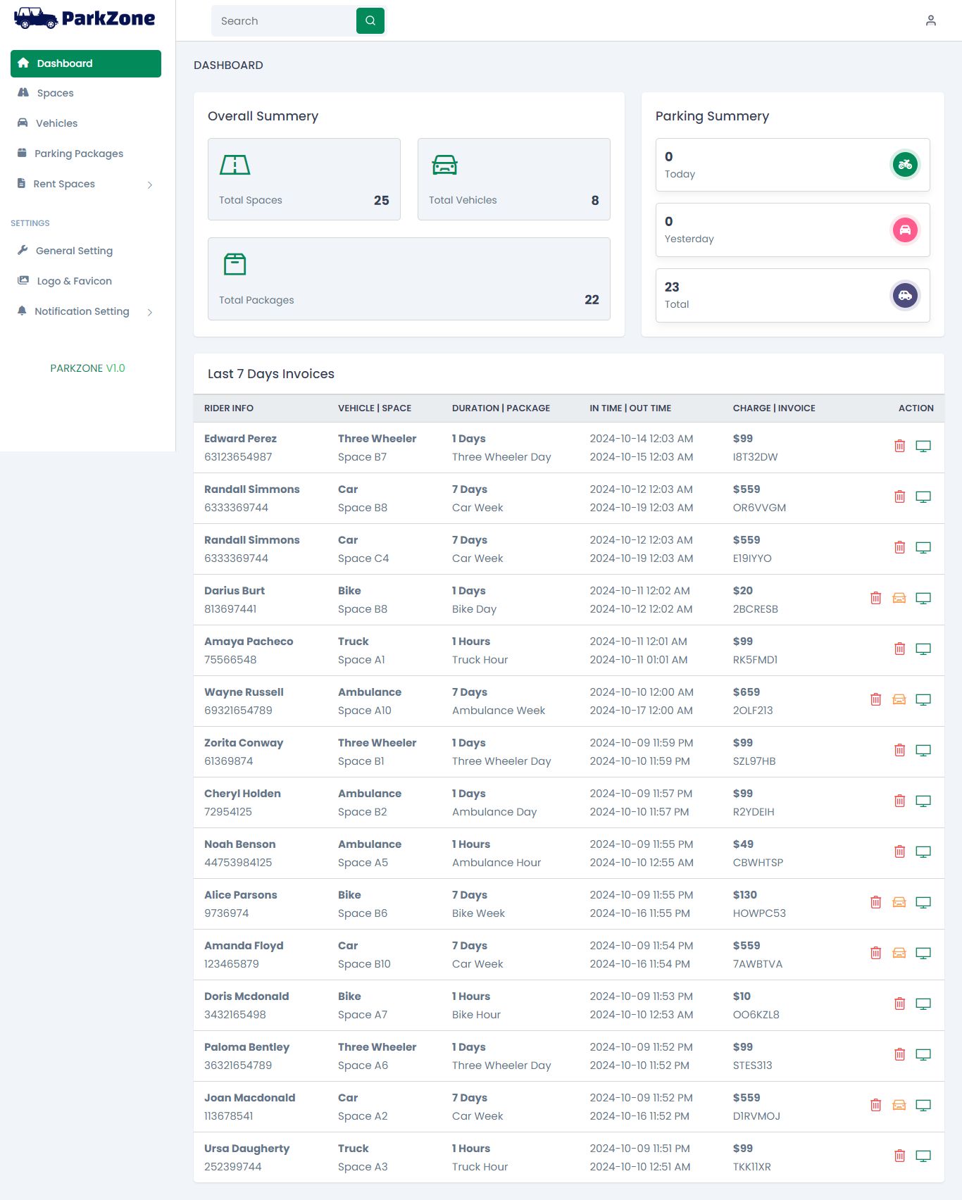 ParkZone is an easy-to-use Parking Billing Management System built with Laravel. It helps you manage parking spaces, vehicles, and packages, and create invoices for parking services.Â