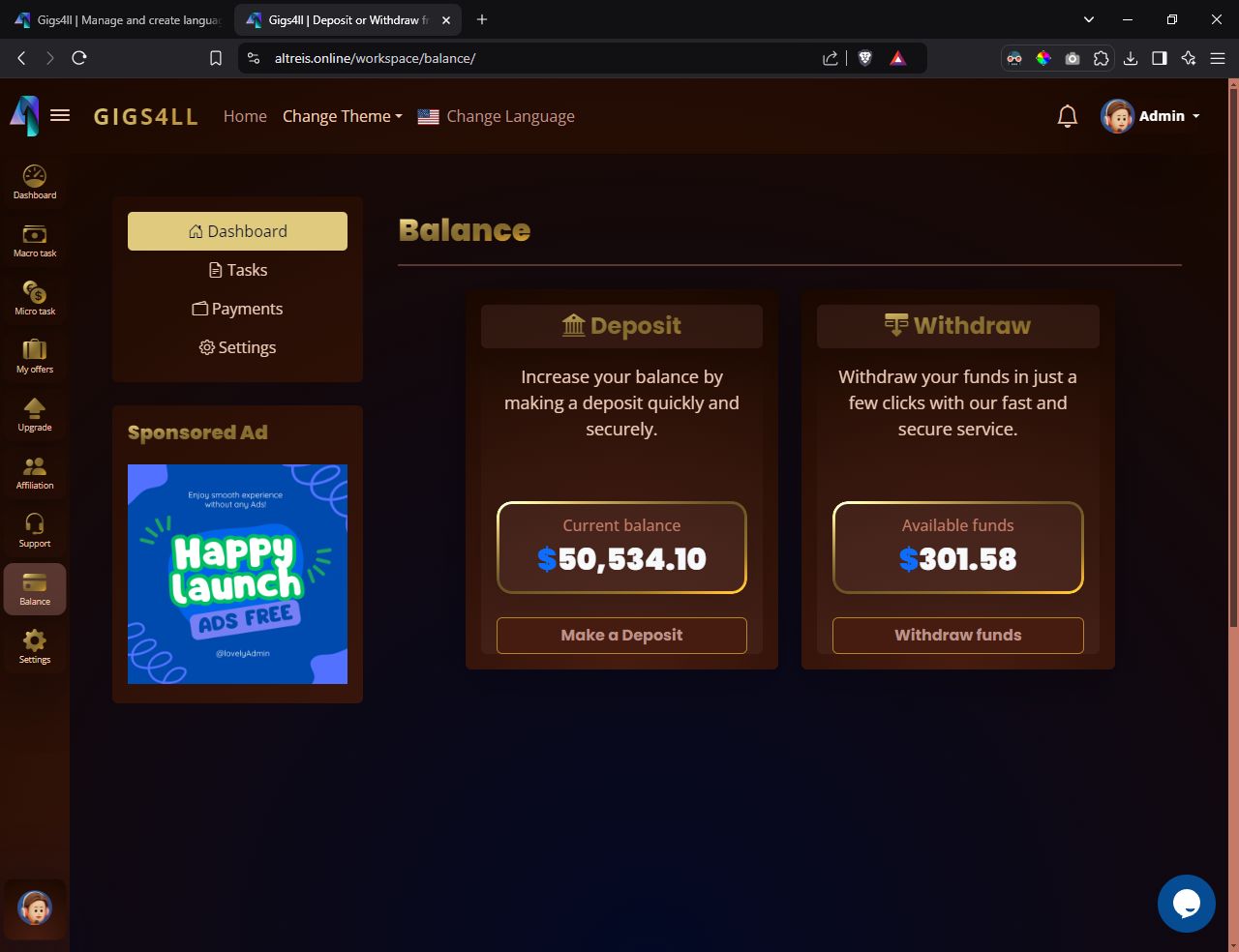 Modern PHP platform for digital services with built-in payment systems, task management, and complete admin tools.