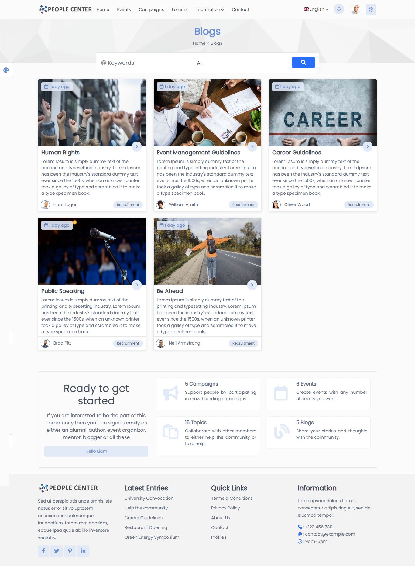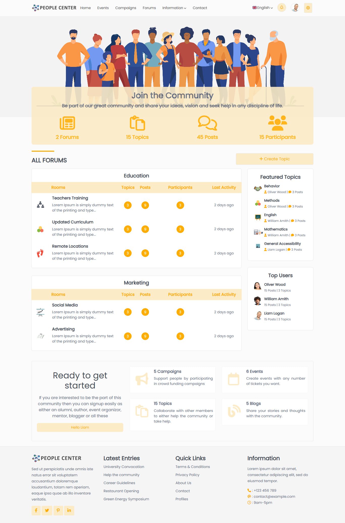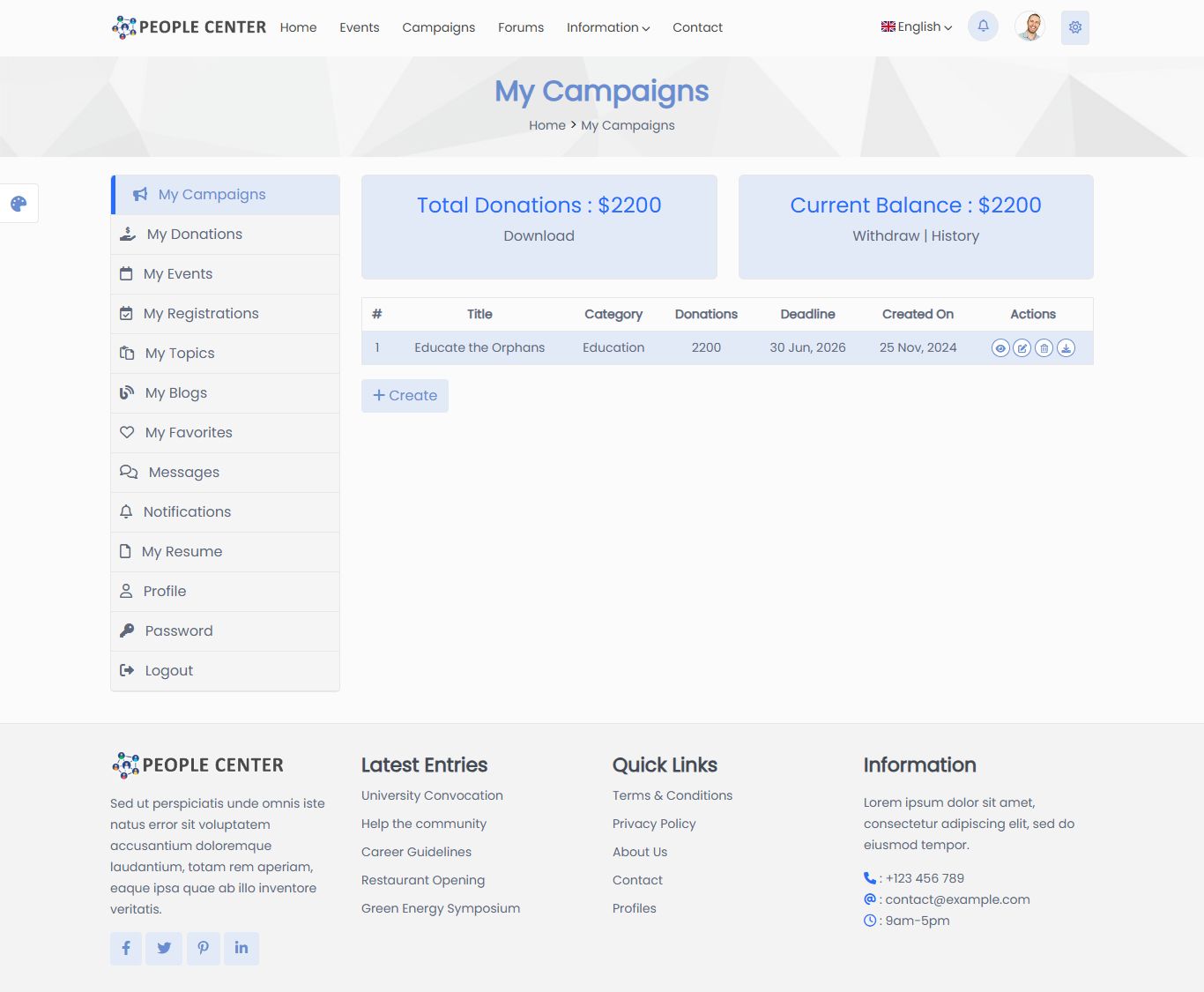 People center is a user collaboration platform which can be used by any organization or group of people where members can create and participate on content whether it be an event, a crowdfunding campaign, a forum topic or a blog. Admin can also create these entities from admin panel and disable the capability for user to create. The script can be used as an events directory and registration site, a crowdfunding campaigns platform, an alumni network, a guest author blogging platform or a combination of all. There are some unique features including popular payment gateways, user chat/messaging system, payment withdrawals for event sales and campaign donations, multi language with RTL support, site CMS management and more.