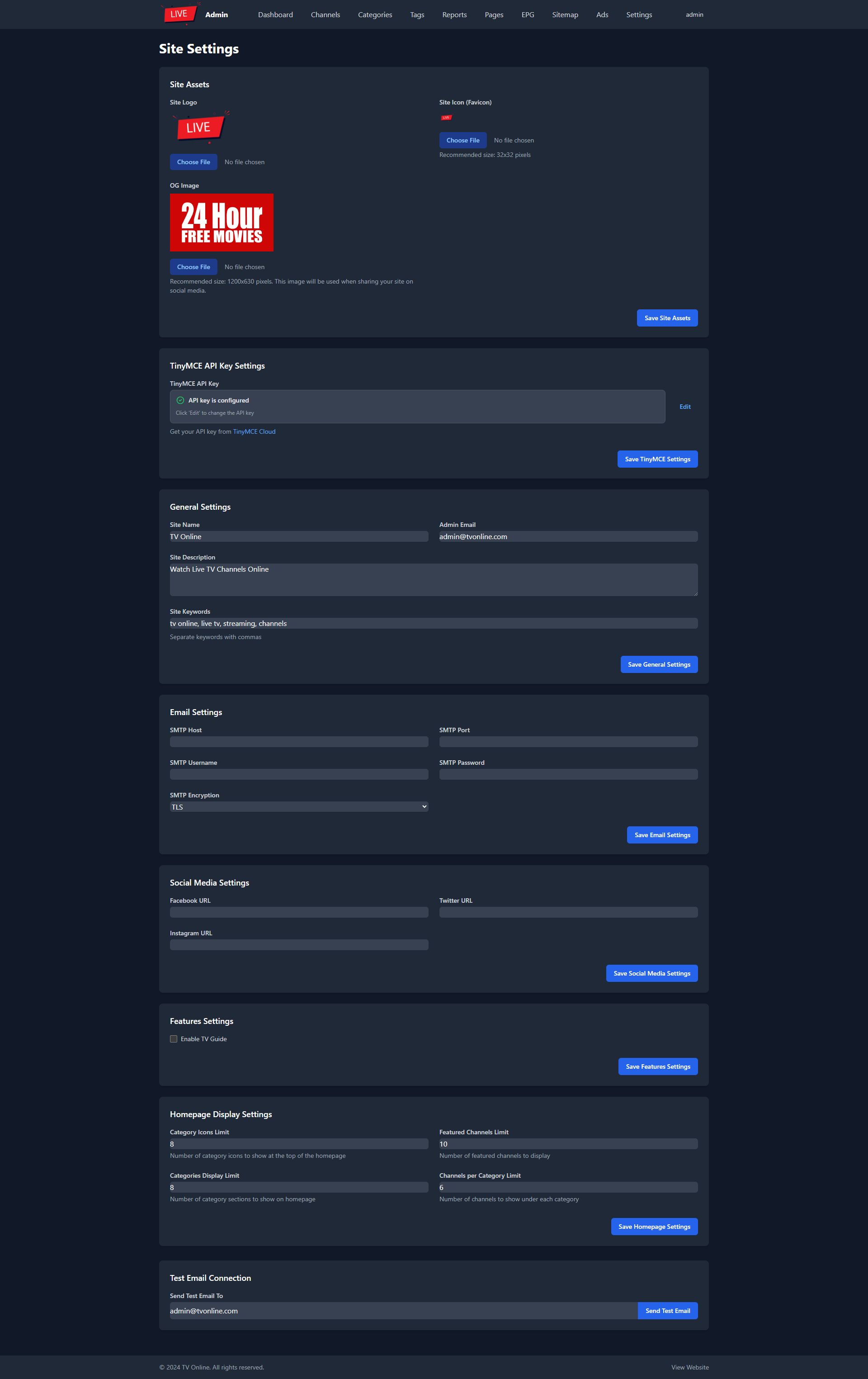| Tags | video streaming, admin dashboard, mysql database, dark mode, ad management, light mode, tv directory, streaming platform, epg integration, tv channel management, iptv service, php application, customizable interface, viewer reports, channel search |
