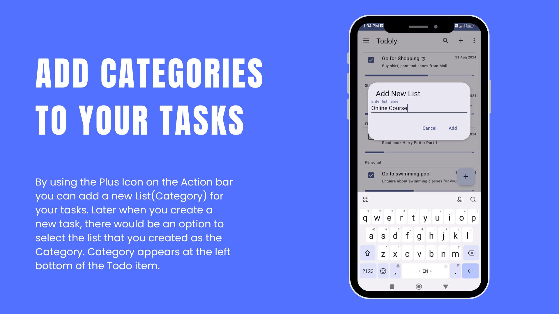 By using the Plus Icon on the Action bar you can add a new List(Category) for your tasks. Later when you create a new task, there would be an option to select the list that you created as the Category. Category appears at the left bottom of the Todo item.