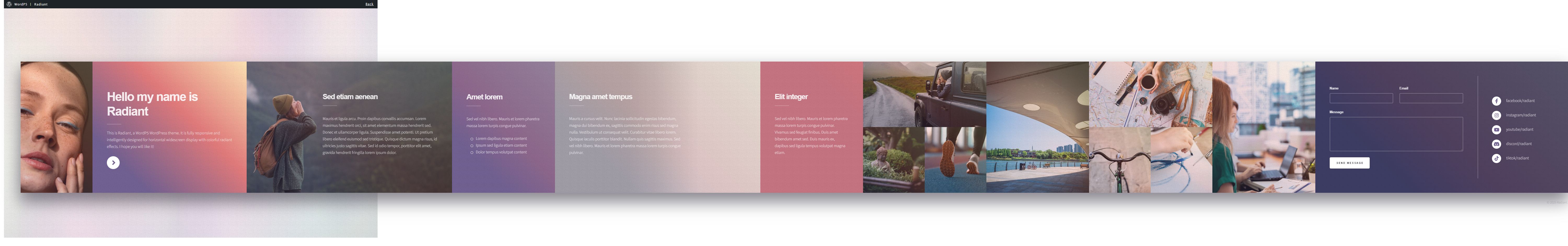 Radiant is a unique one-page horizontal WordPress theme, featuring side-scrolling navigation for a modern and engaging user experience. It offers seamless browsing and high customization options.
