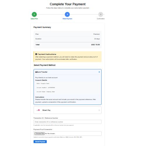 New Features..... Feature Added subscription feature for both admin and user roles Feature Implemented plan status change from default to subscribed after admin approval Feature Removed free subscription system for users Feature Added auto-activation of admin-created default plans for new users Feature Added subscription details display (name, duration, usage) on subscription page Feature Implemented message limit display showing actual plan's message limit Feature Added custom payment gateway with configurable logo, name, and currency Feature Implemented payment account details configuration for administrators Feature Added payment proof screenshot upload functionality Feature Implemented transaction ID input field for payment verification Feature Added transaction management system with approval workflow Feature Implemented transaction status tracking (pending, completed, rejected) Feature Added changelog page to track updates and changes Feature Implemented responsive footer design for better mobile experience Feature Added version number display in the admin sidebar Improvements.... Improvement Enhanced subscription management interface for administrators Improvement Improved payment transaction status display with color-coded badges Improvement Enhanced transaction table with responsive design for mobile devices Improvement Added transaction filtering and sorting capabilities Improvement Implemented payment proof image preview functionality Improvement Added better visual feedback for subscription status Improvement Optimized database queries for better performance Improvement Made CSS responsive for better display across different device sizes Improvement Updated UI elements for better user experience Bug Fixes...... Fix Fixed subscription activation issues after payment approval Fix Resolved message limit calculation for subscription plans Fix Fixed payment transaction status updates not reflecting immediately Fix Resolved transaction history display issues on user dashboard Fix Fixed payment proof image upload validation Fix Corrected transaction currency display issues Fix Corrected subscription expiration date calculation Fix Fixed "New Chat" button functionality in sidebar Fix Resolved issue with payment approval process Fix Fixed missing footer file inclusion error Security.... Security Enhanced input validation for payment processing and transaction data Security Added secure verification process for subscription payments Security Implemented secure storage for payment transaction data Security Added file type validation for payment proof uploads Security Implemented transaction ID validation and sanitization Security Added admin-only access controls for transaction management Security Added permission checks for subscription management Security Improved error handling and logging for payment processes