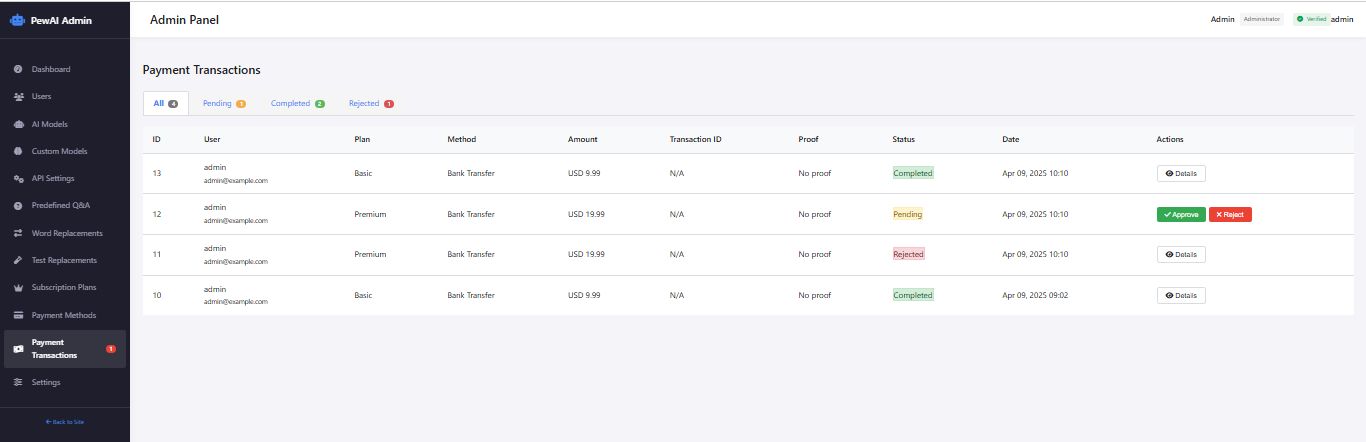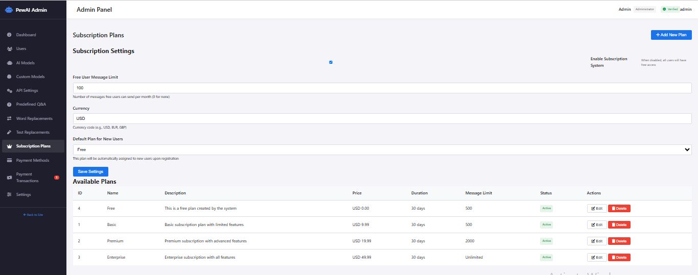 | # PewAI - List of all features ## User interface features 1. Responsive design (mobile, tablet and desktop support) 2. Dark mode support 3. Sidebar toggle (in mobile view) 4. Code syntax highlighting 5. Message copy button 6. Welcome screen 7. Typing indicator (when generating AI response) 8. Conversation history shown in sidebar 9. New chat button 10. AI model selector dropdown 11. Footer support 12. Custom logo and favicon support ## User management 1. User registration 2. User login 3. Password reset 4. Guest chat (without login) 5. Guest chat saved to local storage 6. User profile management 7. Admin and user roles 8. Demo admin role (view only permission) ## AI Features 1. Multiple AI model support (Gemini 1.5 Flash, Gemini 1.5 Pro, etc.) 2. Custom AI model creation and training 3. Predefined question-answer support 4. Word replacement system 5. Cached response system (saved answers for the same question) 6. Google Search API integration 7. Code generation and formatting 8. Multiline message support 9. Message history save and load ## Subscriptions and payments 1. Subscription plan management 2. Multiple subscription tiers (Basic, Premium, Enterprise) 3. Message limit per subscription 4. Multiple payment gateway support (Stripe, Binance, SSL Commerz) 5. Custom payment gateway configuration 6. Payment transaction management 7. Subscription status tracking 8. Subscription expiration Notifications 9. Auto-Activate Default Plan ## Admin Panel 1. Dashboard and Analytics 2. User Management 3. AI Model Configuration 4. Custom Model Management 5. API Settings 6. Predefined Q&A Management 7. Word Replacement Management 8. Test Replacement Tool 9. Subscription Plan Management 10. Payment Method Configuration 11. Payment Transaction Approval 12. System Settings 13. Changelog Management 14. Demo Admin Management 15. Cached Response Management ## System Features 1. Maintenance Mode 2. Installation and Update System 3. API Key Management 4. System Settings Configuration 5. Verification System 6. User Usage Tracking 7. Database Optimization 8. Security Features (XSS Protection, SQL Injection Protection) 9. Error Handling and Logging ## Integrations 1. Google Gemini API Integration 2. Google Search API Integration 3. Payment Gateway Integration (Stripe, Binance, SSL Commerz) 4. Custom Payment Gateway Integration 5. File Upload and Management ## Other Features 1. Authentication Popup (for Guest Users) 2. Multilingual Support 3. Responsive Email Templates 4. User Notification System 5. Version Control and Update System |