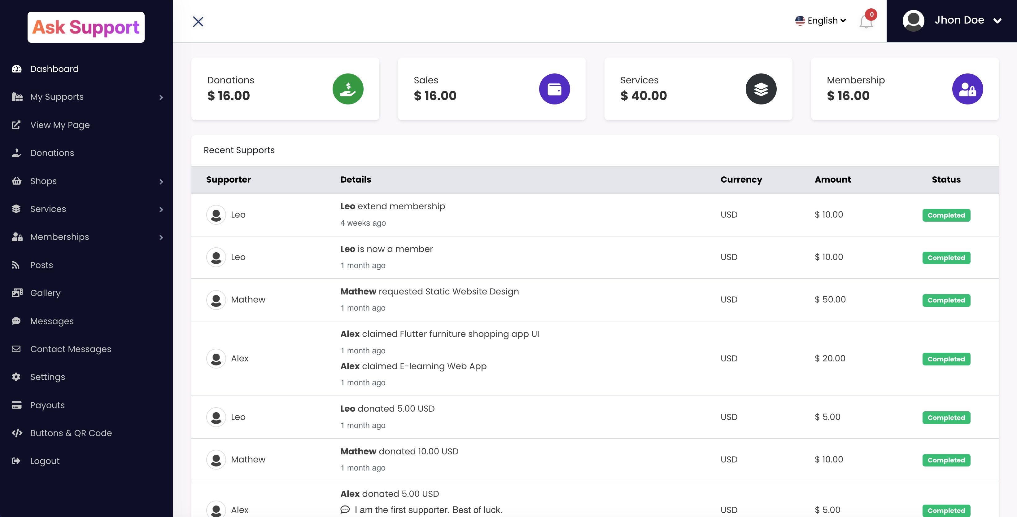 Donate Me is a lightweight, modern, and fully responsive web application that allows content creators, freelancers, developers, and artists to receive monetary support from their audience. With an intuitive user interface and seamless user experience, this platform enables supporters to send donations or tips with just a few clicks, while allowing creators to customize their profile, sell products and services, publish posts, gallery and manage their earnings easily.