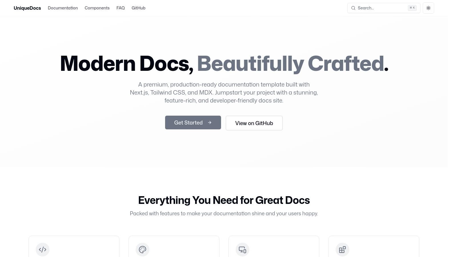 A premium, production-ready documentation template built with Next.js, Tailwind CSS, and MDX.Modern Documentation Template