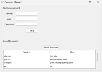 After successful master password setup or verification, you will see three entry fields where you can enter the service name, username, and password; as well a list with all the stored services and a Show password button. If you click on the button after selecting a service from the list, your stored password will be shown.