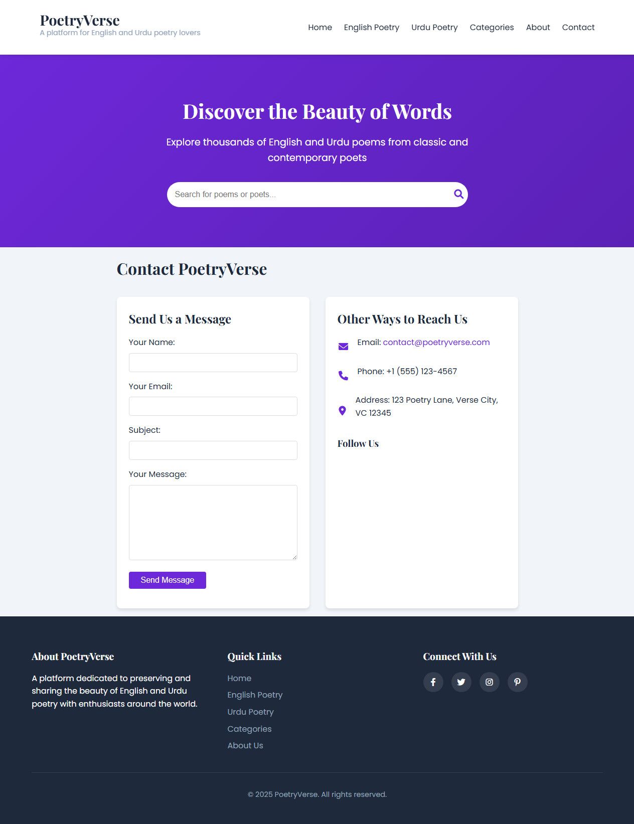 PoetryVerse is a responsive poetry sharing platform supporting both English (via PoetryDB API) and Urdu poetry.