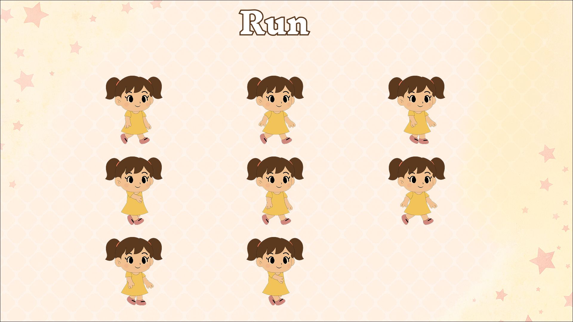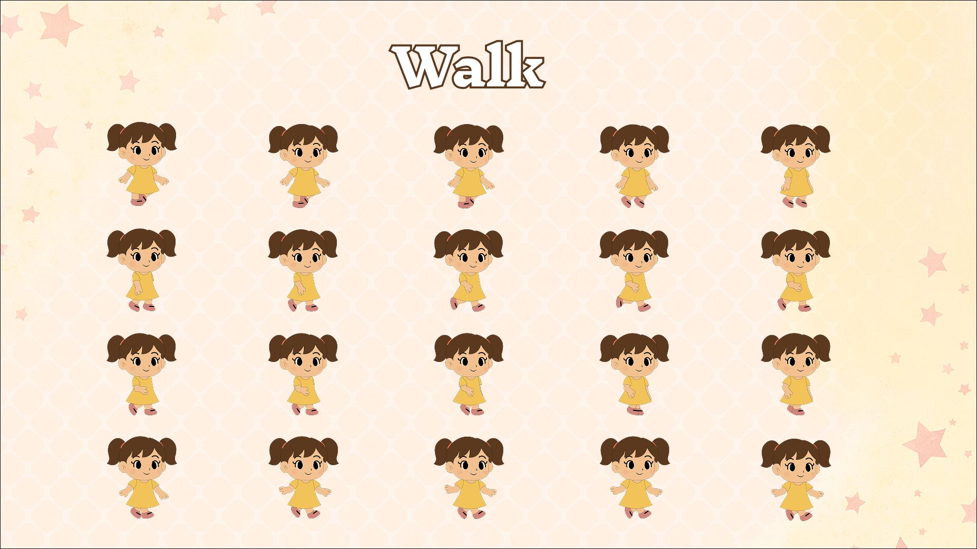 Cute cartoon girl character with Walk, Jump, and Idle animations for 2D games.