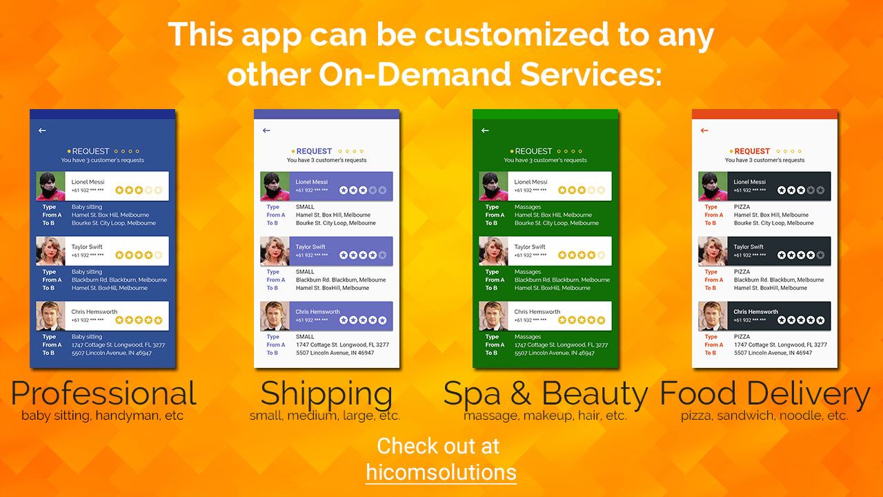 Uber for On Demand Services is completed app template in native source code for iOS devices that help you build Uber style - on demand service booking on smartphones. Everyone can be a Customer (task requester). User can become Tasker (task receiver) after being approved by admin. Customer chooses task types, pickup location and destination location then sends requests. Near taskers will receive request then accept the Task. This app template can use for any kind of services: handyman, delivery, babysitting, repairs, install, taxi, delivery etc. Admin can define each service and rate.