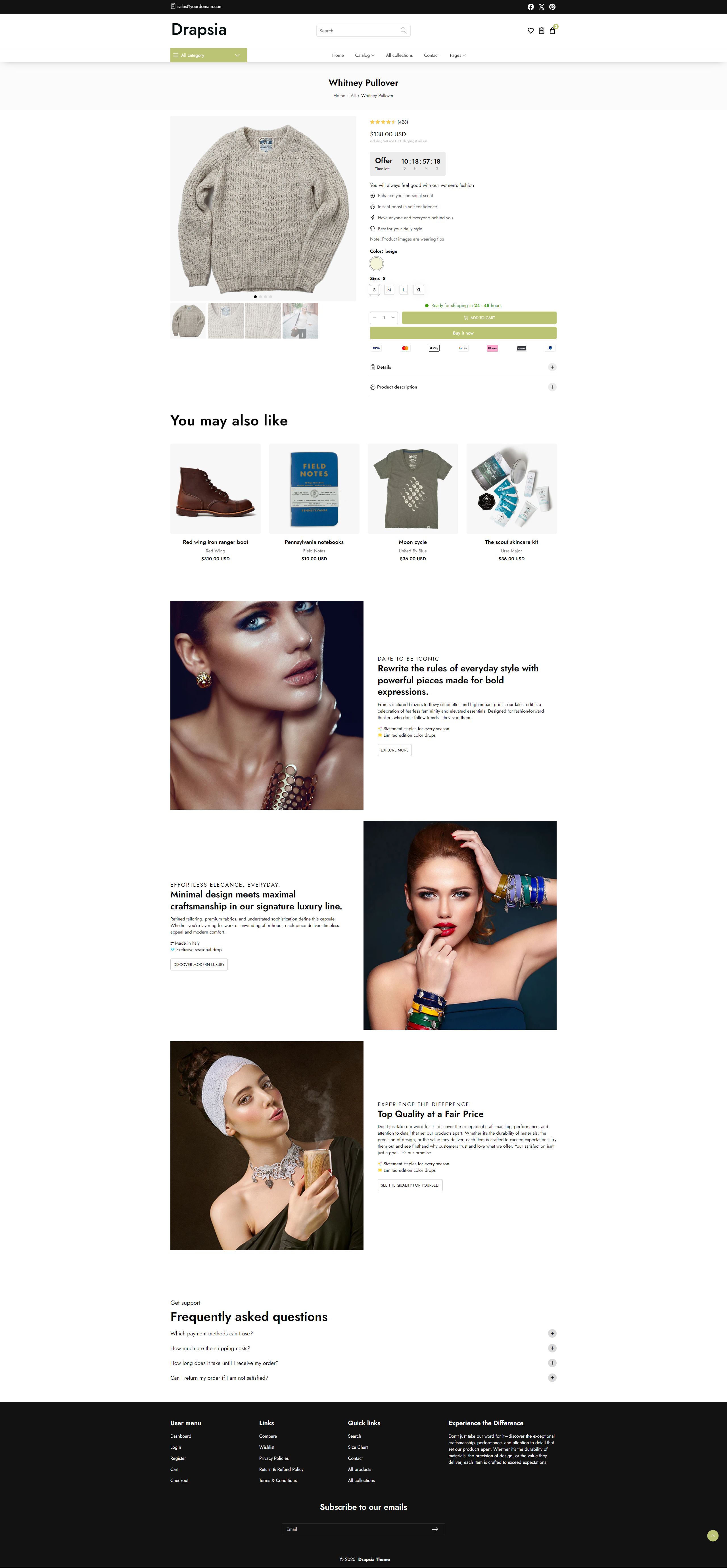 With full compatibility with Shopify Online Store 2.0, you get advanced flexibility, speed, and control over your content. Drapsia is equipped with an extensive library of customizable sections, powerful product tools, and built-in marketing features that make it one of the most comprehensive fashion themes on the market.